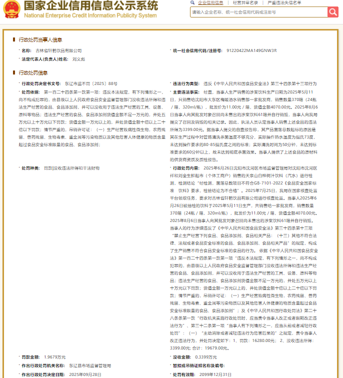 行政处罚事件概述 - 东辽县市场监督管理局对吉林省轩鹤饮品有限公司生产不合格饮料的违法行为作出行政处罚决定,罚没款合计19679元 [1] - 行政处罚决定书文号为东辽市监不罚〔2025〕88号,决定日期为2025年9月28日 [1] 产品不合格详情 - 涉事产品为天泉山白桦树汁饮料(汽水),生产日期为2025年5月11日 [1] - 2025年6月26日沈阳市沈河区市场监督管理局抽检发现,该产品菌落总数项目不符合GB 7101-2022《食品安全国家标准饮料》要求,被判定为不合格 [1] - 不合格原因为生产过程中管路清洗杀菌不彻底:实际热水清洗温度为73摄氏度,未达到80-85摄氏度的标准要求;实际清洗时间为50分钟,未达到60分钟以上的标准要求 [2] 涉事产品生产与销售情况 - 该批次饮料共计生产370箱,每箱24瓶,每瓶320ml [1] - 产品全部销售给沈阳市大东区梅媛酒水销售部,批发价为每箱11元,货值金额为4070元 [1] - 公司主动召回尚未售出的61箱饮料并自行销毁,经核算违法所得为3399元 [1] 处罚法律依据与结果 - 公司行为违反了《中华人民共和国食品安全法》第三十四条第十三项的规定,构成生产销售不符合食品安全标准食品的行为 [2] - 处罚依据为《中华人民共和国食品安全法》第一百二十四条第一款第一项及《中华人民共和国行政处罚法》关于从轻处罚的规定 [2] - 具体处罚为罚款16280元,没收违法所得3399元,合计19679元 [2] 公司基本信息 - 吉林省轩鹤饮品有限公司成立于2017年6月29日,法定代表人为刘文彪,注册资本为500万元 [4] - 公司注册地址位于东辽县渭津镇前凉村七组,所属行业为酒、饮料和精制茶制造业 [4]