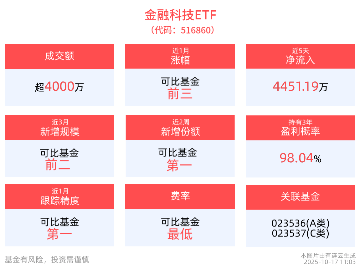 份额方面,金融科技ETF近2周份额增长2100.00万份,实现显著增长,新增份额位居可比基金1/6。 截至2025年10月17日 11:03,中证金融科技主题指数下跌0.64%。成分股方面涨跌互现,东信和平领涨10.02%,中科金财上涨3.15%,恒宝股份上涨3.11%; 东华软件领跌4.08%,古鳌科技下跌3.25%,凌志软件下跌2.94%。金融科技ETF(516860)下跌0.47%,最新报价1.49元。拉长时间看,截至2025年10月16日, 金融科技ETF近3月累计上涨3.89%,涨幅排名可比基金3/6。 流动性方面,金融科技ETF盘中换手1.85%,成交4513.62万元。拉长时间看,截至10月16日,金融科技ETF近1月日均成交2.59亿元,居可比基金前2。 消息面上,作为全球金融领域的年度重要对话平台,2025金融街论坛年会将于10月27日至30日在北京盛大举办。以"创新、变革、重塑下的全球金融发展"为 核心主题,聚焦构建更具韧性、包容性与可持续性的全球金融体系,旨在通过创新驱动与深度协作,为全球金融合作发展注入新动能。 方正证券指出,当前A股科技板块估值处于局部高位,2025年三季度末市盈率升 ...