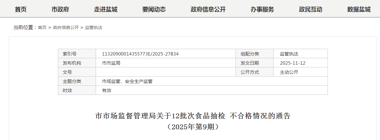 江苏省盐城 市市场监督管理局关于12批次食品抽检不合格情况的通告(2025年第9期)