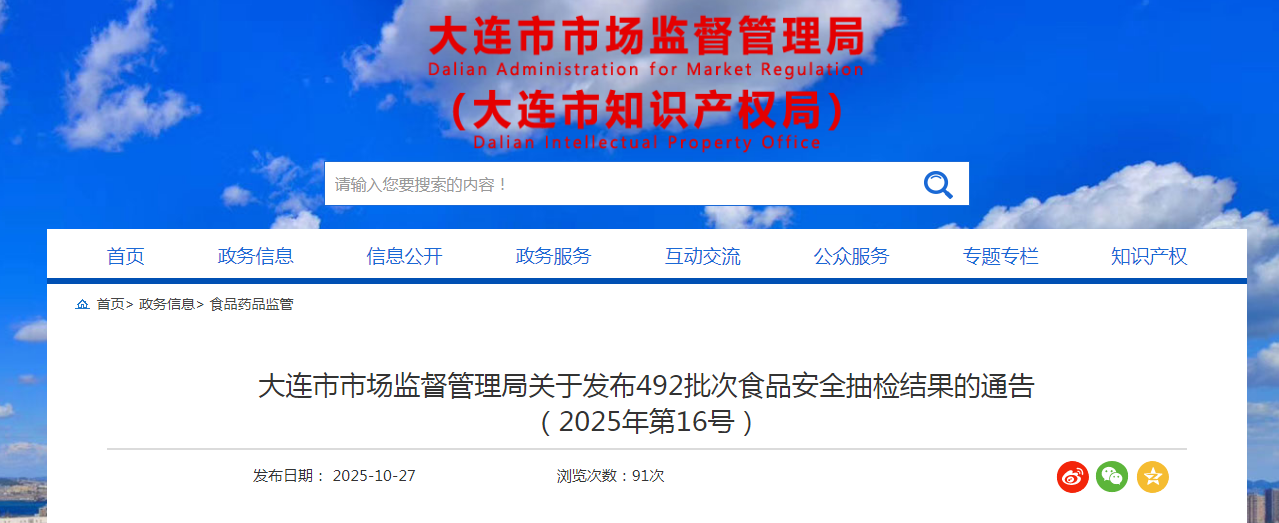 辽宁省大连市市场监督管理局关于发布492批次食品安全抽检结果的通告(2025年第16号)