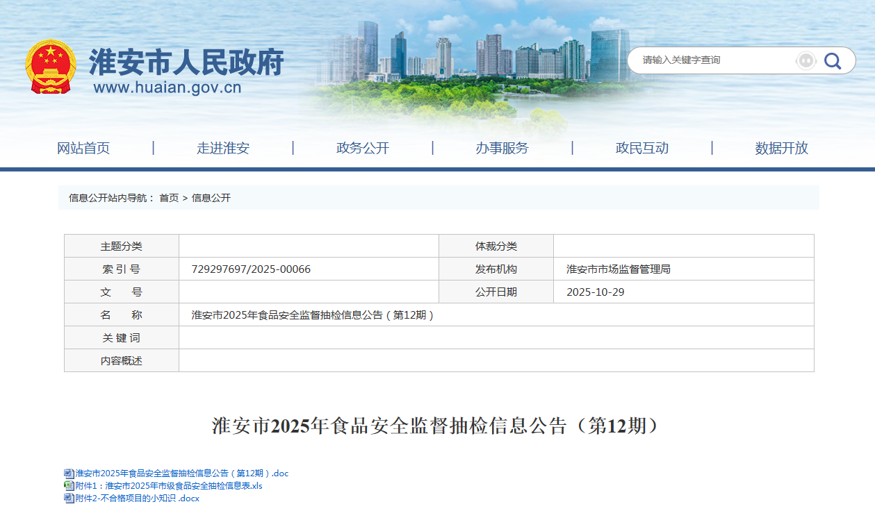 江苏省淮安市2025年食品安全监督抽检信息公告(第12期)