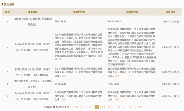 公司融资与股权变更 - 内蒙古西贝餐饮集团有限公司于2026年1月20日完成新一轮融资,注册资本由约8990.3万元人民币增至约1.02亿元人民币,增幅约13% [1] - 新增投资方包括台州新荣泰投资有限公司、呼和浩特市集体共创企业管理中心(有限合伙)、杭州舟轩股权投资管理合伙企业(有限合伙)、周澔宇、成都迅达光电有限公司 [1] - 新增股东持股比例依次为:台州新荣泰投资有限公司4.4209%、呼和浩特市集体共创企业管理中心(有限合伙)4.4209%、杭州舟轩股权投资管理合伙企业(有限合伙)2.2104%、周澔宇0.4421%、成都迅达光电有限公司0.0884% [3] - 本次变更后,北京西贝企业管理有限公司持股35.7946%,贾国龙个人持股26.1644%,两者合计仍为公司实际控制人 [4] - 变更前,北京西贝企业管理有限公司持股40.5249%,贾国龙持股29.8909% [5] 新增投资方背景 - 新增股东台州新荣泰投资有限公司的实际控制人为张勇,其也是高端中餐品牌新荣记的创始人 [5] - 新增股东杭州舟轩股权投资管理合伙企业(有限合伙)的实际控制人为胡晓明,其曾是阿里合伙人、蚂蚁集团CEO [6] - 新增股东呼和浩特市集体共创企业管理中心(有限合伙)的最终受益人为贾国龙,成立于2025年12月30日 [6] 公司近期经营动态 - 公司创始人贾国龙于2026年1月15日证实,西贝将一次性关闭全国102家门店,占门店总数的30% [7] - 关闭的门店计划在一季度陆续完成,公司承诺支付离职员工全额工资,并处理顾客储值卡事宜 [7] - 此前,公司因预制菜争议导致门店客流和营业额受到显著影响,并采取了降价、发放优惠券及给员工涨薪等自救措施 [7] - 截至2025年,西贝全国拥有近400家门店,覆盖62个城市,员工约17000人 [7] - 2025年,公司开启品牌换新,贾国龙重任集团CEO,同年海外首店落地洛杉矶,开启全球化 [7] 公司发展战略与上市计划 - 公司曾计划通过2023年、2024年、2025年的持续发展,到2026年完成IPO上市 [8] - 公司认为预制菜业务需要大规模、高效率带来的低成本,从而需要资本进入以快速发展,但上市计划为集团整体上市,而非预制菜单独板块上市 [8]