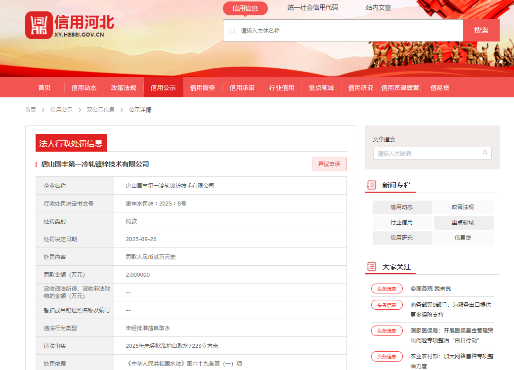 唐山国丰第一冷轧镀锌技术有限公司因“未经批准擅自取水”被罚2万元