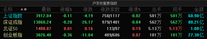A股指数集体低开:沪指跌0.11%,液态金属、培育钻石等板块跌幅居前