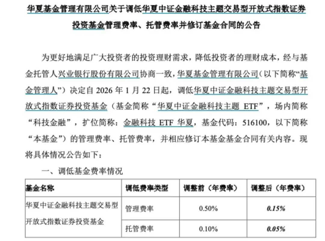 公募基金费率改革全面落地与降费动态 - 历时两年多的公募基金费率改革已全面落地 行业围绕管理费 托管费等的调整效果渐显 [1][7] - 2026年开年以来 多只基金陆续官宣降费 旨在降低投资者成本并提升收益获得感 [2] 近期基金降费具体案例 - 华夏基金自2026年1月22日起 调低金融科技ETF华夏的管理费率年费率由0.50%至0.15% 降幅70% 托管费率年费率由0.10%至0.05% 降幅50% 下调后费率为全市场同类产品最低 [3][5] - 天弘基金自2026年1月21日起 将天弘宁弘六个月持有期混合的管理费由0.7%调降至0.3% 降幅57.1% 托管费由0.15%调降至0.05% 降幅66.7% [5] - 海富通基金自2026年1月21日起 调低海富通瑞祥一年定期开放债券基金管理费率年费率由0.5%至0.4% [5] - 港股通互联网ETF广发及其联接基金自1月19日起 管理费率由0.5%下调至0.15% 托管费率由0.1%下调至0.05% [6] - 华泰保兴恒利中短债债券基金D类份额自1月14日起 销售服务费率年费率由0.20%下调至0.01% [6] - 工银瑞信信用纯债债券托管费率年费率自1月8日起由0.2%下调至0.1% [6] - 中加优享纯债债券托管费率年费率自1月7日起由0.1%下调至0.05% [6] 低费率基金市场现状 - 截至目前 年管理费率在0.15%及以下的基金数量已接近1200只 以股票指数基金 债券基金和货币基金为主 [7] - 年托管费率在0.05%及以下的基金数量已超过2400只 同样以股票指数基金 债券基金和货币基金为主 部分货币基金托管费率低至0.04% [7] - 公募REITs的管理费率普遍为0.1%~0.2% 仅个别产品超过0.5% 托管费率水平低至0.01% 个别为0.015%~0.03% [7] - 主动权益类基金自2023年7月7日起执行统一费率上限 管理费率不得超过1.2% 托管费率不得超过0.2% 目前1.2%和0.2%成为较普遍水平 [7] - 越来越多主动权益产品保持更低费率 如灵活配置混合基金管理费率 托管费率最低分别降至0.4% 0.05% 偏股混合基金有降至0.6% 0.05% 普通股票基金有管理费率在1%以下 [8] 费率改革的行业影响 - 公募基金费率改革被视为一次系统性 结构性的行业生态重塑 而非简单的降费 [8] - 中长期而言 改革将推动行业从规模扩张导向转向服务提升之路 有助于行业可持续发展 [8]