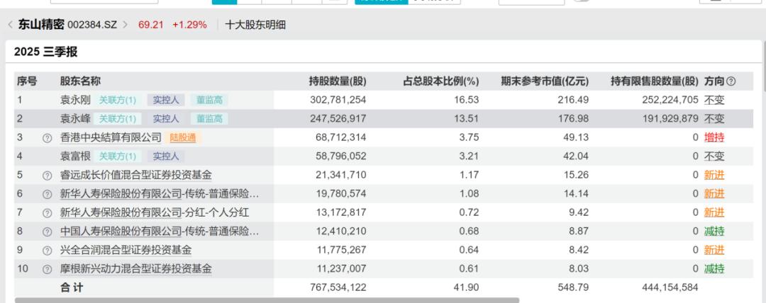 近期,上市公司及公募基金三季报披露了多位知名基金经理的调仓路径。 根据东山精密2025年三季报,傅鹏博管理的睿远成长价值、谢治宇管理的兴全合润、杜猛管理的摩根新兴动力分别位列第五、第九、第十大股东。数据显 示,下半年以来,截至10月22日,东山精密股价涨超81%。 其中,睿远成长价值、兴全合润均为新进前十大股东,睿远成长价值三季度的持股数量由784.88万股增至2134.17万股,兴全合润是新进持有; 摩根新兴动 力三季度则是将持股数量由1246.84万股减少至1123.7万股。 | 序号 | 股东名称 | | 持股数量(股) | 占总股本比例(%) | 期末参考市值(亿元) | 持有限售股数量(股)方向(2 | | --- | --- | --- | --- | --- | --- | --- | | 1 | 壹永刚 关联方(1) | 实控人 黄临高 | 302.781.254 | 16.53 | 216.49 | 252,224,705 不变 | | 2 | 袁永峰 关联方(1) | 实控人 芭监高 | 247.526.917 | 13.51 | 176.98 | 191,929,879 不变 | | 3 ...