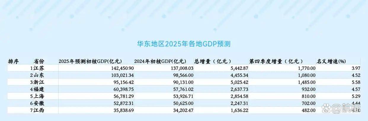 华东6省1市2025年GDP预测:江苏增速不到4%,浙江约10万亿,福建任超上海!