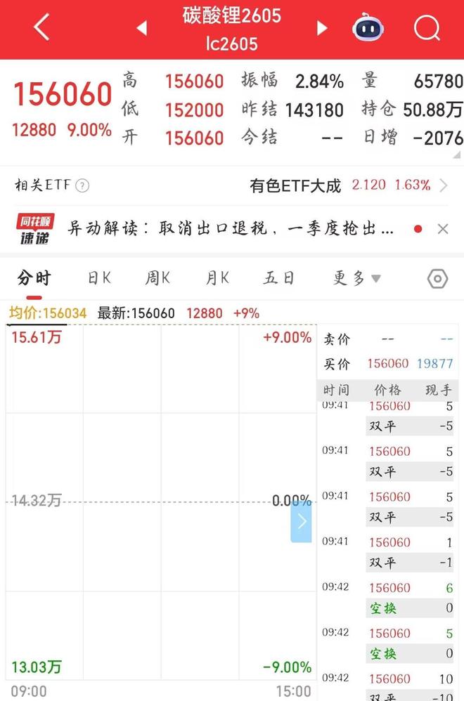 碳酸锂期货价格异动 - 2025年1月12日,国内碳酸锂期货主力合约开盘封死涨停,涨幅达9%,报156060元/吨,为两年来首次突破15万元关口 [1] - 当日合约开盘价即为156060元/吨,较前一交易日结算价143180元上涨12880元 [2] - 截至报道时,合约最新价为156060元/吨,均价为156034元/吨,成交量65780手,持仓量50.88万手 [2] 价格上涨核心驱动因素 - 价格上涨与出口退税政策调整引发的下游抢装需求密切相关 [1] - 财政部、税务总局公告显示,自2026年4月1日起,取消光伏等产品增值税出口退税 [2] - 自2026年4月1日起至12月31日,电池产品增值税出口退税率由9%下调至6%,2027年1月1日起彻底取消 [2] - 政策落地直接刺激下游电池厂商为规避未来成本上升压力,提前启动采购计划,形成集中抢装态势,进而向上游传导引发碳酸锂“抢货潮” [3] 上游供应与行业现状 - 青海某盐湖提锂企业表示,自2025年下半年以来产品销售持续回暖,当前库存已近乎清零,部分客户甚至托关系寻求货源 [3] - 上游材料供应紧张预期形成共振,推动碳酸锂产业热度持续攀升 [3] - 此前锂价长期低迷导致行业部分产能陷入亏损,锂矿复产进程不及预期,供需平衡趋紧 [3]