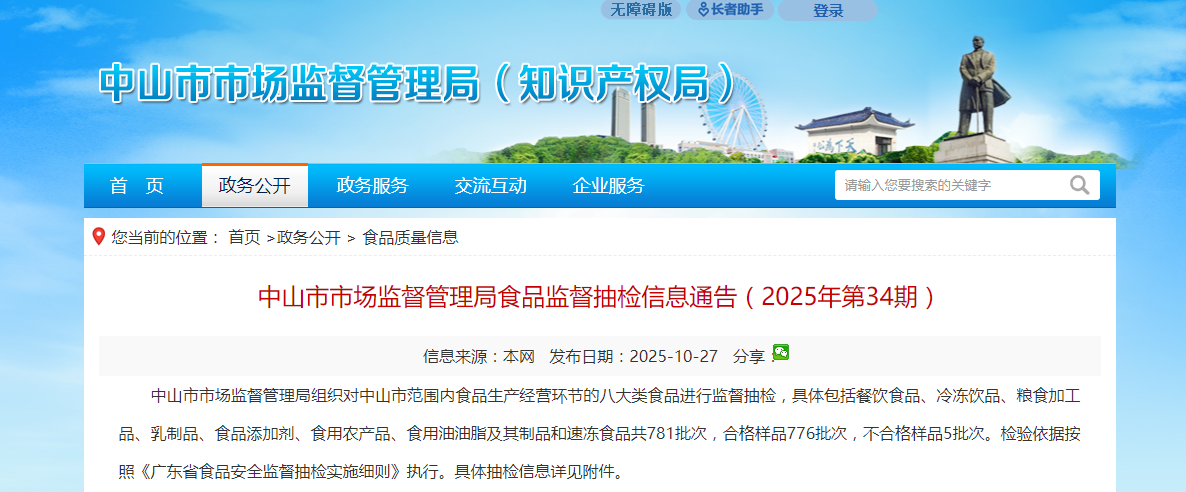 广东省中山市市场监督管理局食品监督抽检信息通告(2025年第34期)