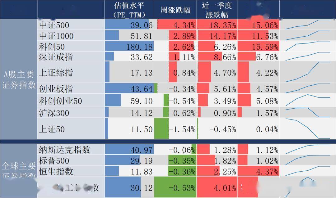 上周市场整体走高,但各大指数表现分化。其中中证500、科创50等指数涨幅领跑,沪深300、上证50却小幅走低。 中信行业板块方面:建材、石油石化、钢铁指数涨幅居前;银行、通信、食品饮料指数跌幅居前。 | | | 估值水平 (PE TTM) | 周涨跌幅 | 近一李度 涨跌幅 | | | --- | --- | --- | --- | --- | --- | | A股主要 | 中证500 | 39. 06 | 4. 34% | 18. 35% | 15.06% | | | 中证1000 | 51.81 | 2. 89% | 14.17% | 11. 53% | | | 科创50 | 180. 18 | 2. 62% | 6. 26% | 15. 59% | | | 深证成指 | 33. 62 | 1. 11% | 8. 66% | 6. 76% | | | 上证综指 | 17.13 | 0. 84% | 4. 70% | 4.22% | | 证券指数 | 创业板指 | 43. 64 | -0. 34% | 5.61% | 4. 57% | | | 科创创业50 | 59. 10 | 0. 54% | 3. 49 ...