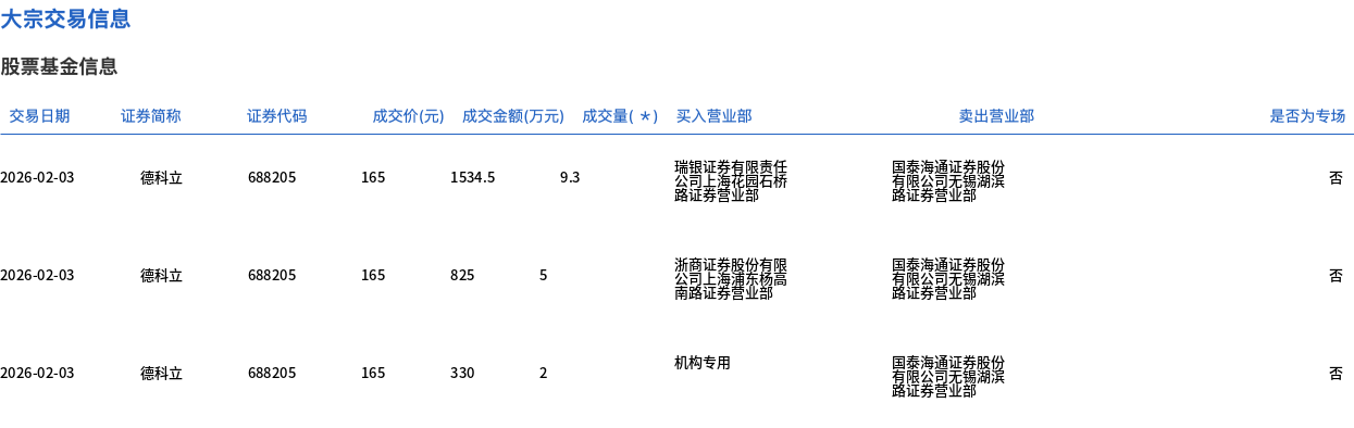 龙虎榜交易数据 - 2026年2月3日,德科立(证券代码:688205)登上龙虎榜,当日成交价1534.5元,成交金额9.3万元,成交量信息不详,买入营业部为“公司上落昆昌若房有限公司天氣用宴”[1] - 同日,该股票另一笔成交价为825元,成交金额信息不详,买入营业部为“公司正意发共享”,卖出营业部为“国泰海通证券股份”[1] - 当日还有一笔成交价为330元,成交金额2万元,买入方为“机构专用”,卖出营业部同样为“国泰海通证券股份”[1]