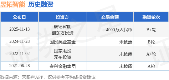 证券之星消息,根据天眼查APP于11月13日公布的信息整理,深圳昱拓智能有限公司B+轮融资,融资额4000万人民币,参与投资的机构包括瑞德 智能,创东方投资。 | 公布日 | 投资方 | 交易全额 | 融资轮次 | | --- | --- | --- | --- | | 2025-11-13 | 瑞德智能 创东方投资 | 4000万人民币 | B+轮 | | 2024-11-28 | 国投美亚基金 | 未披露 | B轮 | | 2022-11-02 | 国家电投 | 未披露 | A+轮 | | | 元祐投资 | | | | 2021-06-28 | 粤科金融集团 | 未披露 | A轮 | 昱拓智能是集科研开发、生产制造、市场营销及工程服务为一体的国家级高新科技企业,围绕机器人视觉伺服控制技术、机器人环境自适应性技 术、机器人模块化可重构带电作业技术、机器人多轴协同高效平稳控制技术、机器人导航技术等核心技术,辅以基于深度学习与智能云的数据智 能分析技术构建研发体系,坚定不移地推动机器人全面替代人工作业。 数据来源:天眼查APP 以上内容为证券之星据公开信息整理,由AI算法生成(网信算备3101043457103 ...