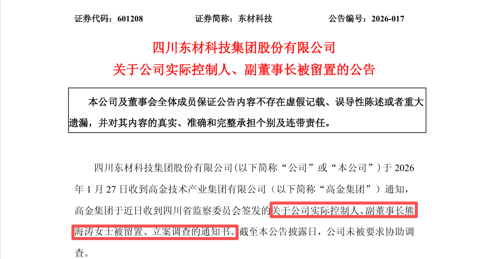 1月27日晚间,东材科技、毅昌科技、高盟新材均公告称,公司实际控制人熊海涛已被四川省监察委员会立案调查并实施留置。 证券代码:601208 证券简称:东材科技 公告编号:2026-017 四川东材科技集团股份有限公司 关于公司实际控制人、副董事长被留置的公告 本公司及董事会全体成员保证公告内容不存在虚假记载、误导性陈述或者重大 遗漏,并对其内容的真实、准确和完整承担个别及连带责任。 四川东材科技集团股份有限公司(以下简称"公司"或"本公司")于 2026 年 1 月 27 日收到高金技术产业集团有限公司(以下简称"高金集团") 通知, 高金集团于近日收到四川省监察委员会签发的关于公司实际控制人、副董事长熊 海涛女士被留置、立案调查的通知书。截至本公告披露日,公司未被要求协助调 查。 证券代码:002420 证券简称:毅昌科技 公告编号:2026-007 广州毅昌科技股份有限公司 关于公司实际控制人被留置的公告 本公司及董事会全体成员保证信息披露的内容真实、准确、完整, 没有虚假记载、误导性陈述或重大遗漏。 广州毅昌科技股份有限公司(以下简称"公司")于 2026 年 1 月 27 日收到四川省监察委员会签发的 ...