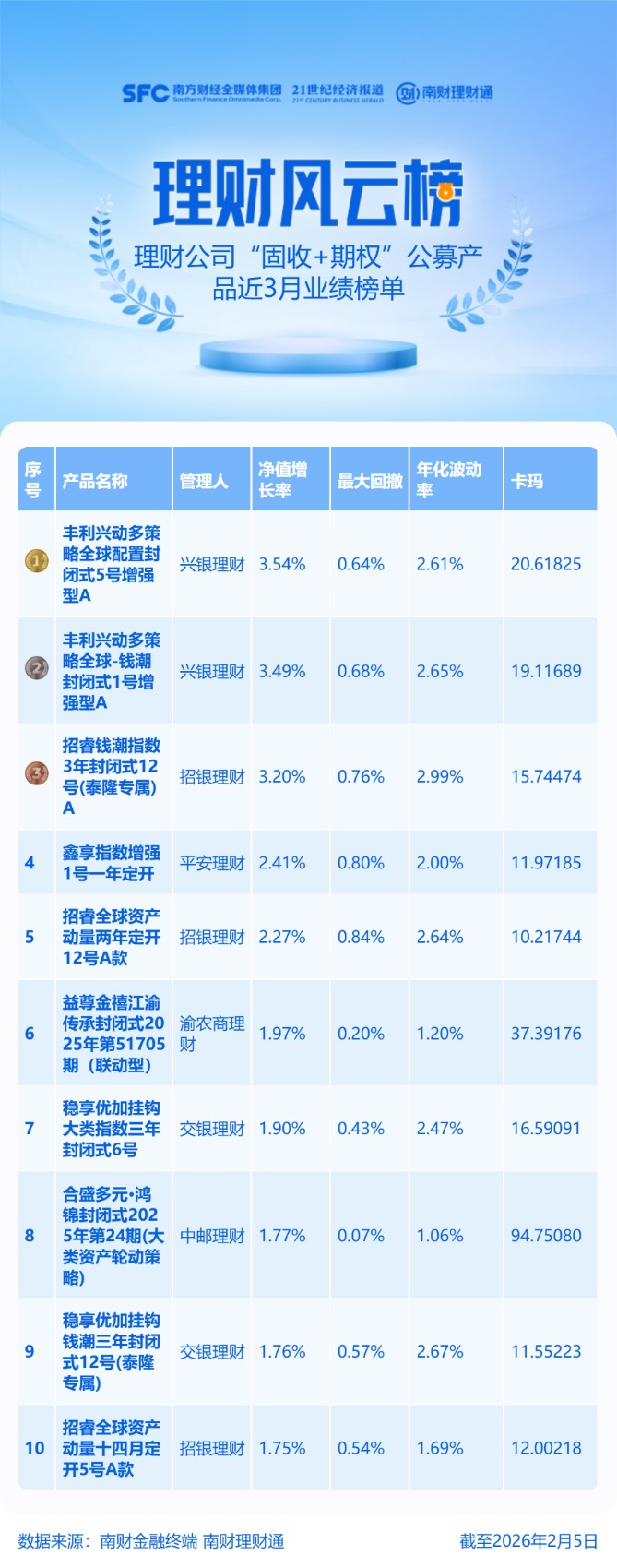 文章核心观点 - 理财公司发行的公募“固收+期权”产品近3个月业绩榜单出炉,行业平均净值增长率为1.42%,前十名产品表现显著优于行业平均,其中多只产品挂钩“钱潮指数”并取得突出收益 [4] 行业整体表现 - 截至2026年2月5日,理财公司共存续219只成立时间在3个月以上的公募“固收+期权”理财产品(各份额分开统计)[4] - 近3个月,行业平均净值增长率为1.42%,平均最大回撤为0.32% [4] 业绩榜单前十名产品表现 - 兴银理财“丰利兴动多策略全球配置封闭式5号增强型A”近3月净值增长率为3.54%,最大回撤0.64%,年化波动率2.61%,位列第一 [2] - 兴银理财“丰利兴动多策略全球-钱潮封闭式1号增强型A”近3月净值增长率为3.49%,最大回撤0.68%,年化波动率2.65%,位列第二 [2] - 招银理财“招睿钱潮指数3年封闭式12号(泰隆专属)A”近3月净值增长率为3.20%,最大回撤0.76%,年化波动率2.99%,位列第三 [2] - 平安理财“蒸享指数增强1号一年定开”近3月净值增长率为2.41%,最大回撤0.80%,年化波动率2.00%,位列第四 [2] - 招银理财“招睿全球资产动量两年定开12号A款”近3月净值增长率为2.27%,最大回撤0.84%,年化波动率2.64%,位列第五 [2] - 渝农商理财“益豐金層加險传承封闭式2025年第51705期(联动型)”近3月净值增长率为1.97%,最大回撤0.20%,年化波动率1.20%,位列第六 [3] - 交银理财“稳享优加挂钩大类指数三年封闭式6号”近3月净值增长率为1.90%,最大回撤0.43%,年化波动率2.47%,位列第七 [3] - 中邮理财“合盛多元·鸿锦封闭式2025年第24期(大类资产轮动策略)”近3月净值增长率为1.77%,最大回撤0.07%,年化波动率1.06%,位列第八 [3] - 交银理财“稳享优加挂钩钱潮三年封闭式12号(泰隆专属)”近3月净值增长率为1.76%,最大回撤0.57%,年化波动率2.67%,位列第九 [3] - 招银理财“招睿全球资产动量十四月定开5号A款”近3月净值增长率为1.75%,最大回撤0.54%,年化波动率1.69%,位列第十 [3] 理财公司上榜分布 - 业绩前十榜单中,招银理财有3只产品上榜,兴银理财、交银理财各有2只产品上榜,平安理财、渝农商理财和中邮理财各有1只产品上榜 [4] 关键挂钩标的指数表现 - 榜单前三名产品均挂钩“钱潮指数”,该指数依托风险平价和动量策略进行全球资产优选 [4] - Wind数据显示,钱潮大类资产趋势策略指数3.2(QCMAT3S.WI)在2025年全年涨幅达7.72% [4] - 中邮理财上榜产品挂钩“中信建投世界大类资产配置宏观对冲指数(WARPMACRO.WI)”,该指数截至2月9日的近1年年化涨幅为6.12%,近3月的年化收益率为2.79% [6] 特定产品详情 - 中邮理财“合盛多元·鸿锦封闭式2025年第24期(大类资产轮动策略)”为2025年10月发行的新产品,到期日为2027年10月26日,存续期限746天,风险等级PR2,募集规模较小,仅19.08万元 [5] - 该产品业绩比较基准为0.3%—4.2%,若年化收益率超过3.50%,产品管理人将收取超出部分的60%作为浮动管理费,剩余40%归客户所有 [6] - 该产品期权策略挂钩世界大类资产配置宏观对冲指数的看涨期权结构,以一定的参与率获取该指数的上涨收益 [6]