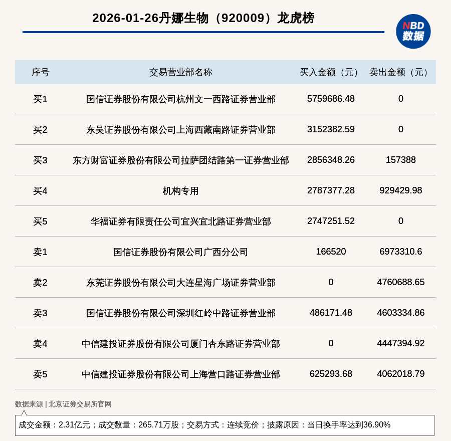 (记者 曾健辉) 每经讯,2026年1月26日,北交所上市公司丹娜生物(920009,收盘价:88.95元)登上龙虎榜,交易方式是连续竞价,披露原因 是当日换手率达到36.90%,成交数量265.71万股,成交金额2.31亿元。买一席位为国信证券股份有限公司杭州文一西路证券营业 部,买入575.97万元;卖一席位为国信证券股份有限公司广西分公司,卖出697.33万元。 | | 2026-01-26丹娜生物 (920009) 龙虎榜 | | | | --- | --- | --- | --- | | 序号 | 交易营业部名称 | 买入金额(元) | 卖出金额(元) | | ਜੇਨ ਹ | 国信证券股份有限公司杭州文一西路证券营业部 | 5759686.48 | 0 | | 买2 | 东吴证券股份有限公司上海西藏南路证券营业部 | 3152382.59 | 0 | | 买3 | 东方财富证券股份有限公司拉萨团结路第一证券营业部 | 2856348.26 | 157388 | | 买4 | 机构专用 | 2787377.28 | 929429.98 | | જેટ | 华福证券有限责任公司宜兴宜北路证券营业部 | ...