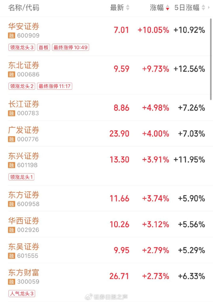 关键时刻,"牛市旗手"崛起。 今日(10月29日)盘中,A股"牛市旗手"券商股集体爆发,华安证券强势涨停,东北证券触及涨停。有分析指 出,券商股的表现强劲主要受三季度业绩超预期推动。另外,沪指突破4000点大关带动市场情绪回暖,也是券 商股走强的原因之一。 受券商股走强带动,沪指成功站上4000点大关,截至午间收盘,沪指涨0.37%,报4002.83点;创业板指数大涨 超1%。对于A股后市,国内券商与外资机构的展望都较为乐观,中国资产价值重估、科技叙事明晰,将持续 推动全球资本增配,中国股市有望步入更具持续性的上行趋势。 "牛市旗手"爆发 10月29日盘中,A股券商股集体拉升,华安证券强势涨停,截至午间收盘,东北证券大涨9.7%,长江证券、广 发证券涨超4%,东方证券、东兴证券、华西证券涨超3%,东方财富、国元证券、国金证券、华泰证券、山西 证券、国泰海通等券商股涨超2%。 | 十 证券(50) | | � | 涨幅% ↑ | 现价 | 量比 | 涨速% | 总市值 | | --- | --- | --- | --- | --- | --- | --- | --- | | 1 | 华安证券 | R | 10. ...