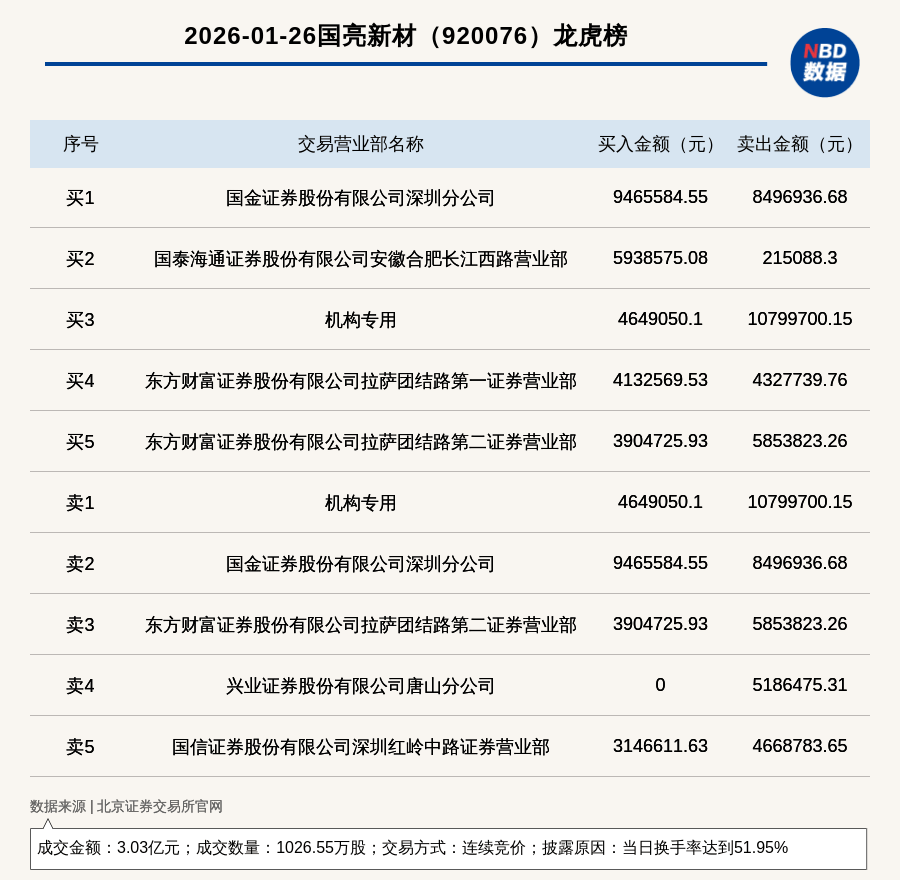 (记者 曾健辉) 免责声明:本文内容与数据仅供参考,不构成投资建议,使用前核实。据此操作,风险自担。 每日经济新闻 每经讯,2026年1月26日,北交所上市公司国亮新材(920076,收盘价:28.59元)登上龙虎榜,交易方式是连续竞价,披露原因 是当日换手率达到51.95%,成交数量1026.55万股,成交金额3.03亿元。买一席位为国金证券股份有限公司深圳分公司,买入 946.56万元;卖一席位为机构专用,卖出1079.97万元。 | | 2026-01-26国亮新材 (920076) 龙虎榜 | | | | --- | --- | --- | --- | | | 交易营业部名称 | 买入金额(元) | 卖出金额(元) | | | 国金证券股份有限公司深圳分公司 | 9465584.55 | 8496936.68 | | | 国泰海通证券股份有限公司安徽合肥长江西路营业部 | 5938575.08 | 215088.3 | | 买3 | 机构专用 | 4649050.1 | 10799700.15 | | | 东方财富证券股份有限公司拉萨团结路第一证券营业部 | 4132569.53 | 4327739. ...