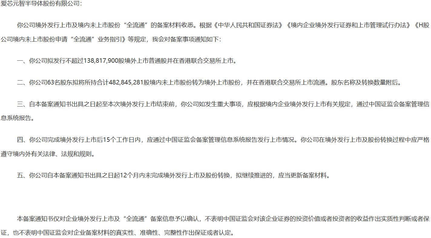智通财经APP获悉,1月28日,中国证监会国际合作司发布《关于爱芯元智半导体股份有限公司境外发行上市及境内未上市股份"全流通"备案通知书》。公 司拟发行不超过138,817,900股境外上市普通股并在香港联合交易所上市。公司63名股东拟将所持合计482,845,281股境内未上市股份转为境外上市股份,并在 香港联合交易所上市流通。 据招股书,爱芯元智是人工智能("AI")推理系统芯片("SoC")的供货商,专注为边缘计算与终端设备AI应用打造高性能感知与计算平台。 附件: | 序号 | 股东名称 | 申请全流通股数(股) | | --- | --- | --- | | 1 | 芜湖旷云人工智能产业投资基金(有限合伙) | 31,081,389 | | 2 | 广东和聚明宏股权投资中心(有限合伙) | 4,000,000 | | 3 | 嘉兴爱芯企业管理合伙企业(有限合伙) | 36,165,580 | | 4 | 嘉兴智芯元智企业管理合伙企业(有限合伙) | 43,104,726 | | 5 | 上海博纳斯企业管理中心(有限合伙) | 22,906,278 | | 6 | 苏州工业园区启明融科股权投资合伙企业 ...