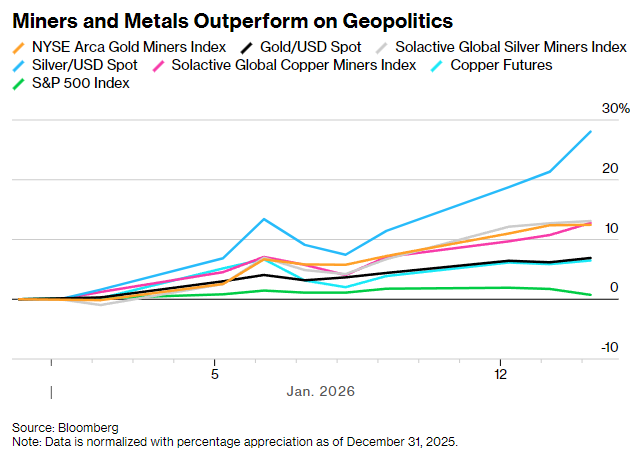 行业表现与驱动因素 - 2026年至今,纽交所Arca黄金矿业指数已上涨约12%,跑赢了现货黄金6.9%的涨幅和标普500指数0.7%的涨幅 [1] - 黄金、白银和铜价在周三均创下历史新高,矿业股在今年开局表现强劲,涨势由地缘政治紧张局势和避险资产需求复苏推动 [1] - 随着美国与伊朗、委内瑞拉之间的风险持续升级,资金加速涌入具备保值属性的大宗商品,不少投资者开始调仓布局矿业股 [1] - 白银波动率更高,在金价上涨带动下涨幅进一步放大;铜价则受供应中断以及美国因关税担忧增加库存等因素提振而持续走高 [4] 公司业绩与市场逻辑 - 2025年,行业龙头纽曼矿业与伊格尔矿业股价均实现翻倍,而同期现货黄金涨幅约为65% [3] - 据分析师预测,纽曼矿业与伊格尔矿业调整后摊薄每股收益同比增幅均将超过85% [3] - 不断上涨的金价为矿业公司带来更为可观的收益增长,因矿企成本上涨往往滞后于金属价格涨幅,这一市场逻辑在去年已催生超额回报 [3] - 亮眼的业绩预期是矿业股在一轮大涨后仍获投资者青睐的核心原因 [3] 价格预测与潜在制约 - 分析师Grant Sporre预测,现货金价有望在年底攀升至每盎司5000美元 [4] - 2026年上半年,美联储暂停加息、美股表现坚挺以及美元维持强势等因素,可能对金价上行空间形成制约 [4] 资金使用与历史教训 - 随着矿企利润水涨船高,投资者的目光逐渐聚焦于企业的资金使用规划 [7] - 此前行业繁荣周期中,成本攀升与盲目并购曾拖累企业表现,这类历史教训若再次上演,或将对矿业股股价形成压力 [7] - 分析师强调,若矿企选择向股东分红或将资金投入业务扩张是积极信号,但在行业周期顶部高价收购其他矿企则可能带来麻烦 [7]