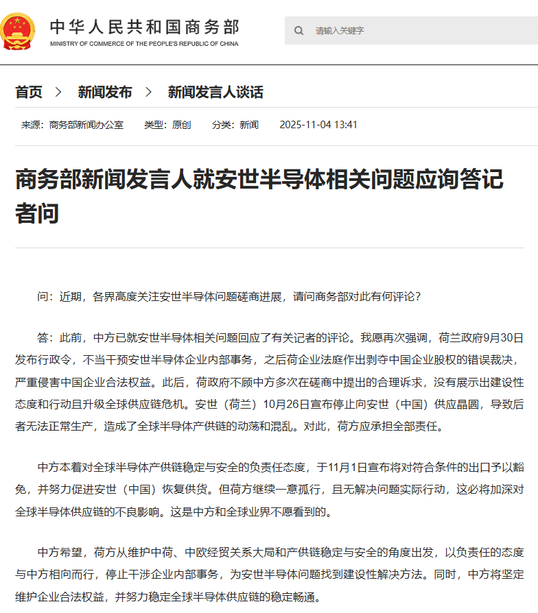 商务部:荷兰政府不当干预安世半导体企业内部事务,中方将维护企业合法权益