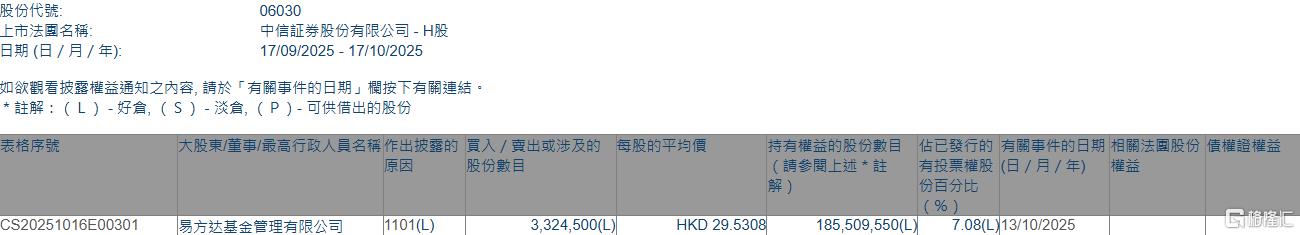 | 表格序號 | 大股東/董事/最高行政人員名稱作出披露的 買入 / 賣出或涉及的 每股的平均價 | | | | | 持有權益的股份數目 佔已發行的 有關事件的日期 | | | --- | --- | --- | --- | --- | --- | --- | --- | | | | 原因 | 股份數目 | | | ( 請参関上述 * 註 | 有投票權股 (日 / 月 / 年) | | | | | | | | | 份百分比 | | | | | | | | | ( % ) | | CS20251016E00301 | 易方达基金管理有限公司 | 1101(L) | | 3,324,500(L) | HKD 29.5308 | 185,509,550(L) | 7.08(L)13/10/2025 | 格隆汇10月17日丨根据联交所最新权益披露资料显示,2025年10月13日,中信证券(06030.HK)获易方达基金管理有限公司在场内以每股均价29.5308港元增 持332.45万股,涉资约9817.51万港元。 增持后,易方达基金管理有限公司最新持股数目为185,509,550股,持股比例由6.95%上升至7.0 ...