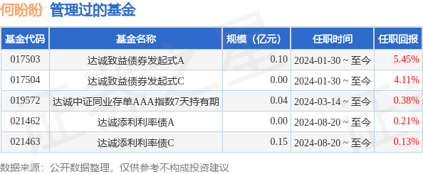证券之星消息,2025年10月17日,达诚定海双月享60天滚动持有短债(013964)发布公告,增聘何盼盼 为基金经理,任职日期自2025年10月17日起,变更后达诚定海双月享60天滚动持有短债(013964)的基 金经理为何盼盼,陈佶。截止2025年10月16日,达诚定海双月享60天滚动持有短债净值为1.1181,较上一 日上涨0.02%,近一年上涨1.78%。 重仓股战绩回顾:其管理的达诚致益债券发起式A在2024年第三季度调入江淮汽车,调入当季均价 100.72,连续持有1个季度后,在2024年第四季度调出,调出当季均价176.55,估算收益率为75.29% (估算收益率按后复权的调入调出季度均价算出)。 以上内容为证券之星据公开信息整理,由AI算法生成(网信算备310104345710301240019号),不构成 投资建议。 | 基金代码 | 基金名称 | 规模(亿元) | 任职时间 | 任职回报 | | --- | --- | --- | --- | --- | | 017503 | 达诚致益债券发起式A | | 0.10 2024-01-30~至今 | 5.45% | | 017504 | 达诚 ...