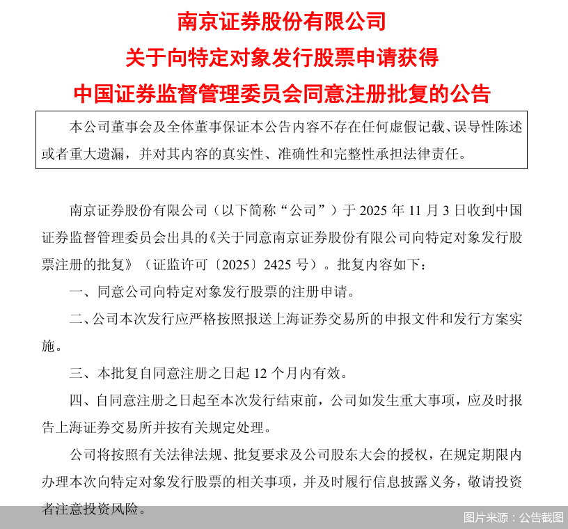 (文章来源:证券日报) 证券日报网讯 11月3日晚间,南京证券发布公告称,公司于2025年11月3日收到中国证券监督管理委员 会出具的《关于同意南京证券股份有限公司向特定对象发行股票注册的批复》(证监许可〔2025〕2425 号)。批复内容如下:一、同意公司向特定对象发行股票的注册申请。二、公司本次发行应严格按照报 送上海证券交易所的申报文件和发行方案实施。三、本批复自同意注册之日起12个月内有效。四、自同 意注册之日起至本次发行结束前,公司如发生重大事项,应及时报告上海证券交易所并按有关规定处 理。 ...