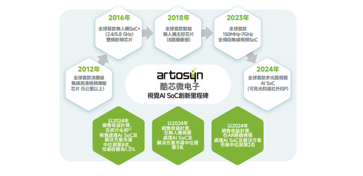 公司概况与业务模式 - 合肥酷芯微电子股份有限公司于近日向香港联交所提交上市申请,公司成立于2011年,并于2025年12月完成股份制改制,总部位于安徽合肥 [1][12] - 公司采用无晶圆厂经营模式,专注于视觉处理AI SoC与无线视频传输SoC的研发、设计及销售,核心竞争力源于全栈自主研发能力,涵盖智能感知、计算与传输的完整技术框架 [1][12] - 公司产品以高算力、低功耗、低传输时延为核心优势,形成了覆盖无人机、智能物联、智能可穿戴领域的多元化产品组合,同时提供技术服务与IP授权,构建了“芯片+模块+算法+服务”的集成化解决方案 [3][14] 技术实力与产品里程碑 - 公司拥有多项“全球首款”产品:2012年推出传输距离超5公里的无线高清视频传输芯片,2016年研发全球首款无人机双频射频SoC,2023年推出8路摄像头全频段无线视频SoC,2024年发布全球首款消费级多光视觉AI SoC(融合可见光和远红外ISP)[3][14] 财务表现与盈利能力 - 公司营收实现跨越式增长:2023年总营收为人民币1.05亿元,2024年大幅增长至人民币4.49亿元,同比增长327.1%,2025年前九个月营收为人民币3.41亿元 [8][18] - 公司毛利率持续显著提升:从2023年的11.2%大幅增至2024年的32.2%,2025年前九个月进一步提升至44.3% [7][19] - 分业务毛利率表现优异:2025年前九个月,无人机芯片毛利率达67.5%,智能物联芯片毛利率为37.2%,智能可穿戴芯片毛利率为24.4%,技术服务毛利率高达80.1% [7][19] - 公司目前仍处于亏损阶段但亏损持续收窄:2023年净亏损人民币3.08亿元,2024年净亏损人民币2.16亿元,2025年前九个月净亏损大幅收窄至人民币227.7万元 [10][20] 各业务板块分析 - **无人机业务**:是公司最早布局的核心领域,覆盖消费级与工业级低空经济全场景需求,2024年以8.0%的市场份额位列中国无人机视觉处理AI SoC市场第三 [4][16] - **无人机业务财务贡献**:2024年无人机业务贡献营收人民币2.77亿元,占当年总营收的61.7%,其中模块产品单价区间为人民币127.4-2998.6元,芯片产品单价区间为人民币45.8-267.4元 [4][16] - **智能物联业务**:产品应用于扫地机器人、割草机器人、智能门铃、无线IP相机等设备,并拓展至拇指相机、手持云台相机等新兴领域 [5][16] - **智能物联业务财务表现**:2024年营收达人民币1.54亿元,较2023年的人民币3453万元实现大幅增长,模块产品单价最高达人民币3362.8元,芯片产品单价区间为人民币45.2-223.4元 [5][16] - **智能可穿戴业务**:产品专为AR/AI眼镜设计,并拓展至智能手表、智能耳机等品类,是公司增长最快的业务板块之一 [5][17] - **智能可穿戴业务财务表现**:2024年实现营收人民币4383万元,单价不超过人民币150元,2025年前九个月营收增至人民币6896万元,单价上限提升至人民币220元 [5][17] - **技术服务业务**:主要来自IP授权及智能可穿戴产品设计服务,2024年营收达人民币1380万元,2025年前九个月增至人民币2860万元 [5][17] 行业市场前景 - **全球市场**:视觉处理AI SoC全球市场规模从2020年的人民币146亿元增至2024年的人民币559亿元,复合年增长率达39.8%,预计2029年将达到人民币1483亿元 [6][17] - **中国市场**:视觉处理AI SoC中国市场规模从2020年的人民币83亿元增长至2024年的人民币343亿元,复合年增长率42.4%,2029年预计将达人民币993亿元 [6][17] - **细分场景市场规模**: - 无人机:2024年中国市场规模为人民币35亿元,预计2029年增至人民币87亿元 [6][18] - 智能物联:2024年中国市场规模为人民币159亿元,2029年将达人民币401亿元 [6][18] - 智能可穿戴:增长最为迅猛,2024年中国市场规模为人民币19亿元,预计2029年将飙升至人民币116亿元,复合年增长率达44.2% [6][18] 市场竞争格局 - 中国视觉处理AI SoC市场整体较为分散,公司2024年以人民币4000万元营收、1.3%的市场份额位列第八 [7][18] - 在无人机细分领域,公司凭借技术积累与客户资源,已跻身市场前三,形成了差异化竞争优势 [7][18] - 行业进入壁垒较高,新进入者需突破客户验证、技术研发、人才储备、供应链管理及资本投入等多重门槛 [7][18] 募资用途与股权结构 - 本次上市募资拟用于四大方向:升级SoC产品组合;支持目标应用场景的产品应用拓展;开展投资及收购活动;补充营运资金及一般公司用途 [10][20] - 公司的单一最大股东组由姚海平、沈泊博士、钟琪及上海灵眸、上海慧眸、上海基璇组成,合计持有公司32.8%的股份,上述股东已订立一致行动人士协议 [10][20]