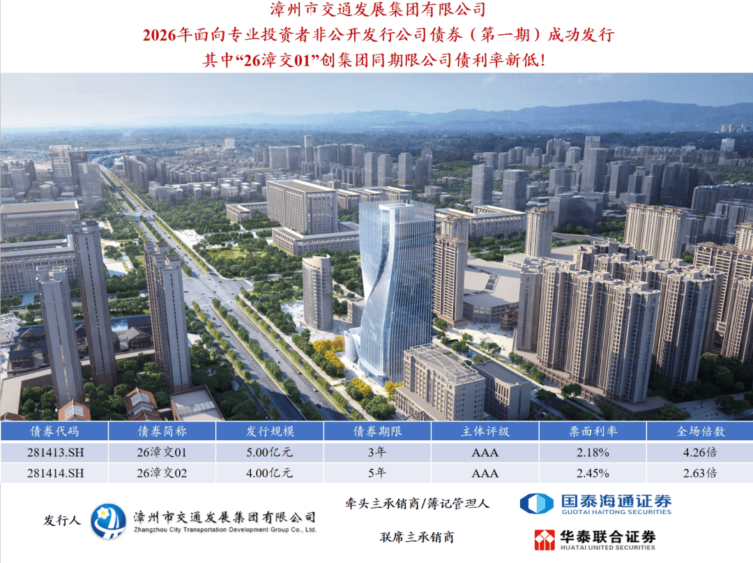 债券发行概况 - 漳州市交通发展集团有限公司成功非公开发行2026年公司债券(第一期),发行总额为人民币9亿元 [1] - 本期债券为双品种结构,包含3年期品种“26漳交01”和5年期品种“26漳交02” [1] 发行条款详情 - 3年期品种“26漳交01”发行规模为5亿元,票面利率为2.18%,全场认购倍数为4.26倍 [1] - 5年期品种“26漳交02”发行规模为4亿元,票面利率为2.45%,全场认购倍数为2.63倍 [1] - 3年期品种“26漳交01”的票面利率创下集团同期限公司债券利率的历史新低 [1] 发行参与机构 - 本期债券的牵头主承销商为国泰海通证券,联席主承销商为华泰联合证券 [1]