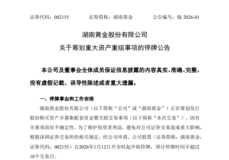湖南黄金收购交易核心信息 - 公司计划以发行股份方式收购湖南黄金天岳矿业有限公司及湖南中南黄金冶炼有限公司的100%股权,交易尚处筹划阶段[1][2] - 交易对手方控股股东湖南黄金集团有限责任公司,持有公司35.06%的股份,此举意味着控股股东将黄金资源注入上市公司平台[1] - 公司因筹划该事项自1月12日起停牌,预计停牌时间不超过10个交易日[2] 收购标的公司详情 - 中南冶炼是湖南黄金集团的全资子公司,成立于2006年8月,为中南地区唯一处理高砷高硫金精矿的黄金冶炼企业[2] - 中南冶炼生产规模为年处理金精矿8万吨,年产黄金4吨、工业硫酸4万吨,年产值超20亿元[2] - 黄金天岳由湖南黄金集团持股51%、湖南天岳投资集团持股49%[2] - 黄金天岳在湖南平江县万古金矿田拥有5个采矿权和7个探矿权,该矿田曾因媒体报道发现远景储量超1000吨、资源价值达6000亿元而受关注[3] - 万古金矿田探矿核心区累计探获黄金资源量300.2吨,金品位最高达138克/吨[3] 行业背景与趋势 - 国际金价持续上涨,1月12日现货黄金史上首次涨破4600美元/盎司,2024年累计涨幅超过70%[4] - A股矿业公司积极在全球寻找黄金资源,例如洛阳钼业于2025年12月以10.15亿美元收购多个金矿资产,预计交易完成后公司金的年产量达8吨[4] - 紫金矿业、江西铜业、盛屯矿业等公司在2025年以来也纷纷出手布局或加码黄金资源[4] - 全球矿产金供应增速呈趋势性下滑,2020年至2024年均产量增速仅为+0.5%,2024年增速回升至0.7%但仍处十年低位[4][5] - 矿产金供给占黄金供给总量约75%,显示全球黄金实际有效供给已极为刚性[5]