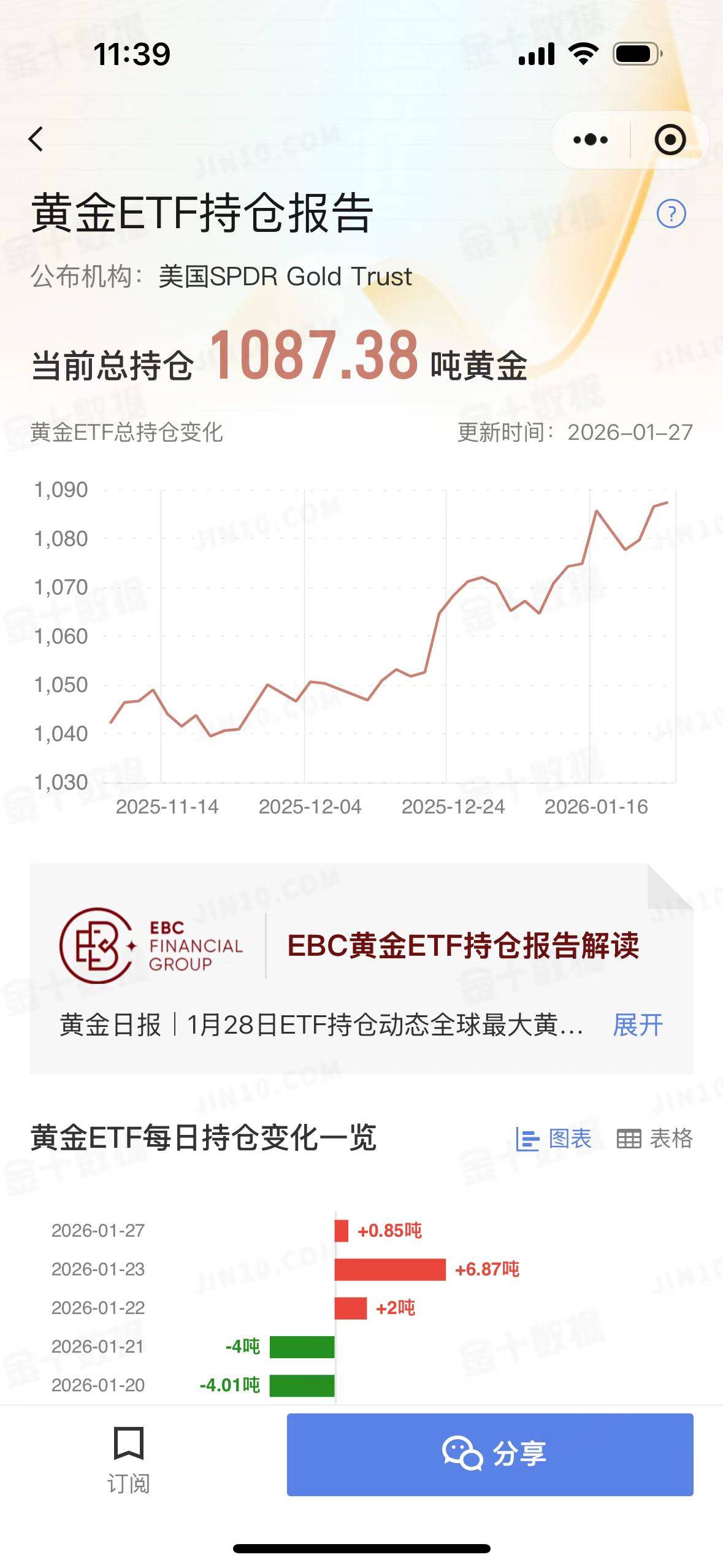 公布机构:美国SPDR Gold Trust 当前总持仓 1087.38 吨黄金 黄金ETF总持合变化 更新时间:2026-01-2 11:39 黄金ETF持仓报告 截至1月27日,全球最大的黄金ETF SPDR Gold Trust持仓量为1086.53吨,较前一个交易日增加0.85吨。 1月27日,受到特朗普关税政策、地缘政治紧张局势,美国联邦政府关门风险加剧等因素影响,现货黄金延续近日的涨势,日内重回5100美元/盎司,最高狂 飙至5190.06美元/盎司,逼近5200美元大关,续创纪录高位,收于5181.04美元/盎司,涨172.69美元/3.45%。 基本面消息,特朗普政府的关税威胁加剧了市场避险情绪。据央视新闻,特朗普表示,鉴于韩国方面尚未通过该项"具有历史意义的贸易协议",他已决定将 对韩国汽车、木材、制药产品以及其他对等关税项目的税率从15%上调至25%。关税政策的不确定性,继续支撑资金涌入黄金以避险。 另外,中东、俄乌等地缘政治紧张局势持续,进一步强化了市场的避险情绪。德意志银行在最新报告中称,地缘政治波动加剧对大宗商品价格的影响尤为明 显,黄金的持续上涨由持续的投资动机驱动,全球各国军费开 ...