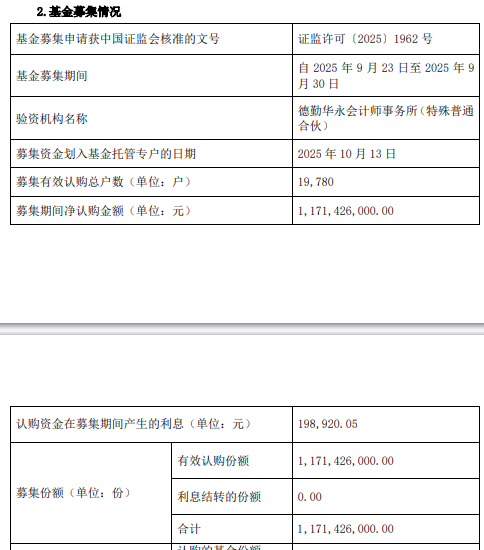 基金产品成立 - 广发中证卫星产业交易型开放式指数证券投资基金正式成立,基金合同于2025年10月14日生效 [1] - 基金募集期间净认购金额为1,171,426,000元,有效认购总户数为19,780户 [1][3] - 募集期间认购资金产生利息198,920.05元,募集份额合计1,171,426,000.00份 [1][5] 基金募集细节 - 基金募集申请获得中国证监会核准,文号为证监许可〔2025〕1962号 [3] - 募集期间自2025年9月23日至2025年9月30日,募集资金于2025年10月13日划入基金托管专户 [3] - 验资机构为德勤华永会计师事务所(特殊普通合伙) [3] 基金经理背景 - 基金经理吕鑫自2025年3月起在广发基金担任多只主题ETF基金的基金经理,覆盖高股息、云计算、大数据、通信、半导体材料设备、港股通央企红利及自由现金流等多个投资主题 [2] - 吕鑫在指数投资和量化研究领域经验丰富,曾任职于建信基金和大家资产管理有限责任公司 [2]