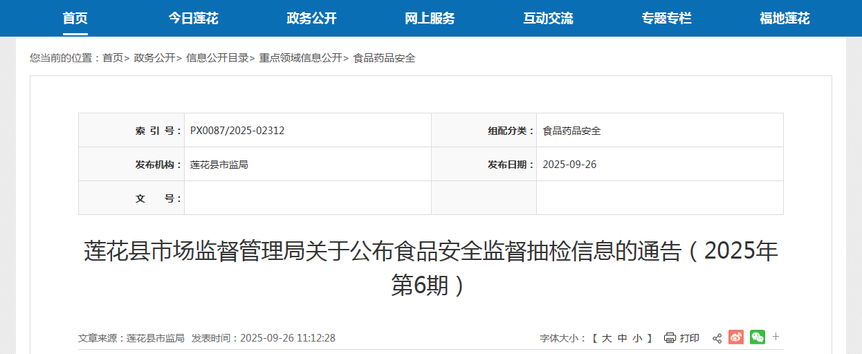 江西省莲花县市场监督管理局关于公布食品安全监督抽检信息的通告(2025年第6期)
