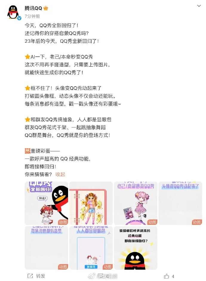 公司产品更新 - 腾讯于1月24日正式官宣QQ秀全新回归,该功能上线已23周年[1] - 此次更新包括使用AI驱动生成专属形象的形象创建环节[3] - 更新后QQ头像可变为动态QQ秀小人,且QQ秀首次进入群聊支持与其他好友形象互动[4] 产品历史与战略背景 - QQ秀于23年前推出后受到用户追捧,代表中国互联网从通讯工具向个性化社交平台的转变[4] - 2021年11月,腾讯在PC版QQ 9.5.2版本中将QQ秀从聊天窗口显眼位置移除,改为需额外按钮访问的“折叠”状态,此举被视为其“时代落幕”[4] - 最近一年QQ动作频频,包括QQ经典版回归、推出消息新形态Q泡及闪传等功能[4] 用户反馈与市场反应 - 部分网友对QQ秀回归表示欣慰,但也有用户认为“味道不对了”,并询问旧版及经典QQ秀的回归[5] - 有用户表示“找不到我的秀了”,并呼吁QQ红钻及QQ宠物等经典功能回归[5][6]