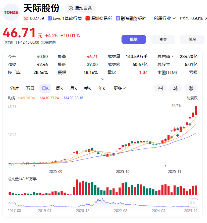 28个交易日收盘价格涨幅累计偏离215.24%, 天际股份 (002759)股价距离前高已"近在咫尺"。然而,就在这波股价疯狂上涨的期间,公司控股股东汕头 天际在股票交易严重异常波动期间卖出公司股票840万股,结果还"卖飞了"。 支撑这场股价狂欢的,除了一路上涨的 六氟磷酸锂 价格之外,或许还有仅投入500万元且尚处早期阶段的硫化锂材料研发项目。 28个交易日收盘价格涨幅累计偏离215.24% 11月12日晚间,天际股份披露股票交易严重异常波动的公告,公告显示,股票连续28个交易日(2025年9月26日至2025年11月12日)收盘价格涨幅累计偏 离215.24%,属于股票交易严重异常波动的情况。 天际股份的六氟磷酸锂产能在国内次于天赐材料及多氟多,同期却超同行,除了六氟磷酸锂价格"一骑绝尘"之外,或还在于固态电解质概念的"拱火"。 天际股份主营产品是六氟磷酸锂及相关 氟化工 产品、次磷酸钠及相关 磷化工 产品、小家电系列产品。2025年半年报显示,六氟磷酸锂营收占公司总营收 的67%。 针对固态电解质的进展,天际股份今年6月份在互动平台中表示"目前公司在推进该专利的产业化,相关研发和试验工作正在有序进行", ...