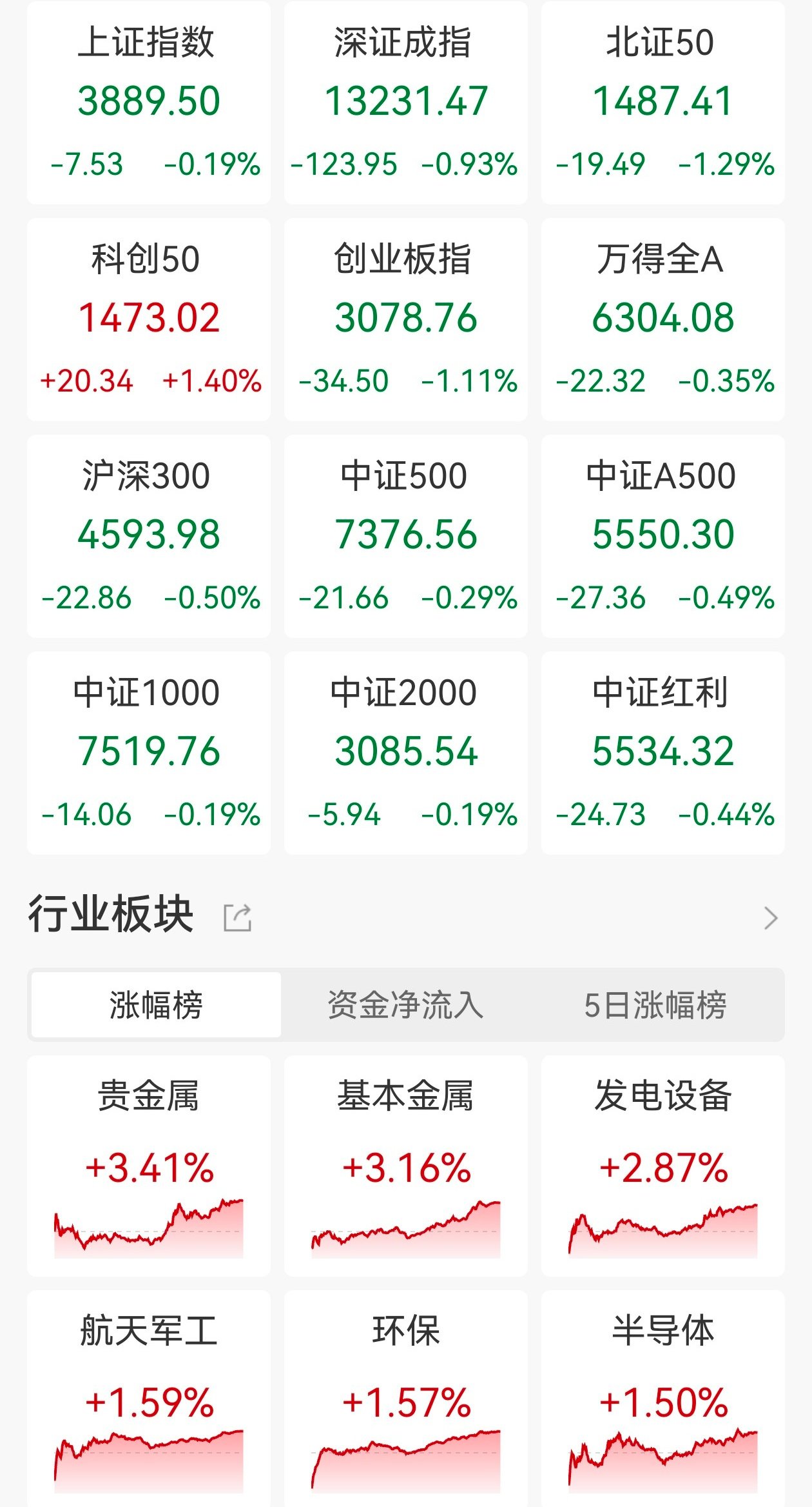 市场整体表现 - A股主要指数早盘集体大跌但尾盘回升,沪指跌0.19%报3889点,深证成指跌0.93%,创业板指跌1.11% [1] - 科创50指数逆市上涨1.4% [1] - 全市场成交额2.37万亿元,较前一交易日缩量1599亿元 [1] - 超3600只个股下跌 [1] 领涨板块与驱动因素 - 稀土板块爆发,银河磁体、新莱福等多股涨停,驱动因素为商务部对稀土相关物项实施出口管制 [1] - 贵金属及黄金板块活跃,西部黄金、招金黄金涨停,驱动因素为国际金价屡创新高 [1] - 光刻机概念股走高,新莱应材涨停 [1] - 可控核聚变板块走强,合锻智能等多股涨停,驱动因素为上海正推动中国聚变能源有限公司在沪成立 [1] - 小金属、中芯概念及电子化学品等板块涨幅居前 [1] - 近5日涨幅榜显示贵金属板块资金净流入2.879(单位未明确),涨幅达3.41% [2] - 发电设备板块近5日涨幅3.16%,基本金属板块涨幅3.16% [2] - 环保、半导体、航天军工板块近5日涨幅分别为1.59%、1.57%、1.50% [2] 领跌板块 - 机器人及减速器板块走低,斯菱股份领跌 [1] - 汽车零部件板块下挫,宁波华翔跌超8% [1] - 消费电子板块普跌,协创数据跌超6% [1] - 混合现实、CRO、小米汽车及减肥药等板块跌幅居前 [1]