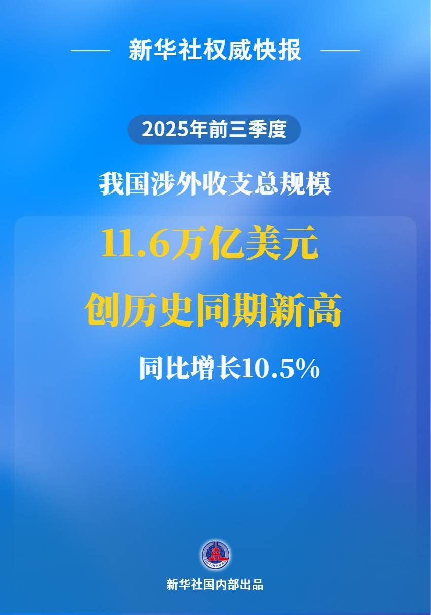 同比增长10.5% 跨境资金净流入1197亿美元 银行结售汇顺差632亿美元 新华社权威快报 2025年前三季度 我国涉外收支总规模 11.6万亿美元 创历史同期新高 同比增长10.5% 新华社国内部出品 国家外汇管理局10月22日发布数据显示 今年前三季度 我国涉外收支总规模11.6万亿美元 创历史同期新高 海报制作:刘开雄 新华社国内部出品 均高于上年同期水平 今年以来 我国外汇市场运行稳健、预期平稳 表现出较强的韧性和活力 记者:刘开雄 ...