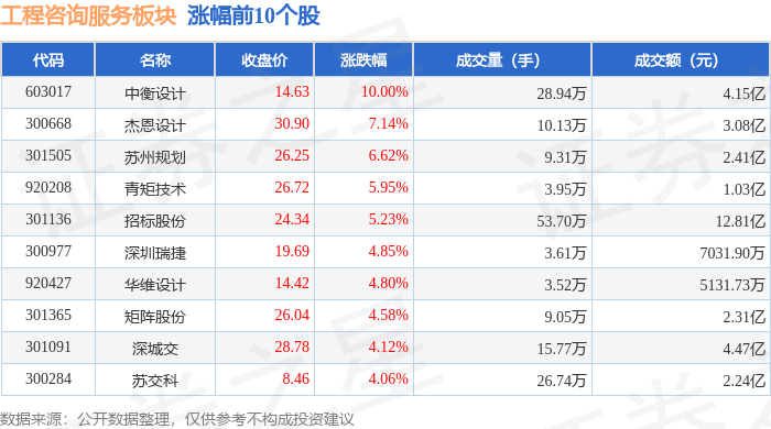 证券之星消息,1月12日工程咨询服务板块较上一交易日上涨0.95%,中衡设计领涨。当日上证指数报收 于4165.29,上涨1.09%。深证成指报收于14366.91,上涨1.75%。工程咨询服务板块个股涨跌见下表: | 代码 | 名称 | 收盘价 | 涨跌幅 | 成交量(手) | 成交额(元) | | --- | --- | --- | --- | --- | --- | | 600629 | 华建集团 | 23.48 | -4.55% | 94.96万 | 22.54亿 | | 300844 | 山水比德 | 38.40 | -2.29% | 2.12万 | 8212.41万 | | 002949 | 华阳国际 | 15.87 | -1.18% | 5.10万 | 8100.49万 | | 600846 | 同济科技 | 14.11 | -0.98% | 6 9.09万 | 1.28亿 | | 300492 | 类图山路 | 87.51 | -0.75% | 4.06万 | 3.56亿 | | 300983 | 尤安设计 | 27.30 | -0.69% | 1.22万 | 3341.32万 | | 301 ...