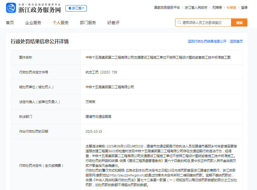 齐鲁晚报·齐鲁壹点记者于浙江政务服务网行政处罚栏获悉,10月15日,中铁十五局集团第二工程有限公司(下称"中铁 十五局第二工程公司")收建德市交通运输局罚单,处罚决定书文号:杭交工罚﹝2025﹞739。 | 全国一体化在线 改务服务平台 浙江政务服务网 | ● 加瓦炭◎ | 国家政务服务平台 浙江省人民政府 元障碍 长丰版 登录 | | | --- | --- | --- | --- | | 企业服务 | 个人服务 | 部门服务 ○ 建筑项目人员工伤参保登记 捜索 好差评 | 首页 | | 行政处罚结果信息公开详情 | | 返回行政处罚结果信息公开 返回首页 | | | 案件名称 | | 中铁十五局集团第二工程有限公司交通建设工程施工单位不按照工程设计图纸或者施工技术标准施工程 | | | 行政处罚决定文书号 | | 杭交工罚〔2025〕739 | | | 被处罚单位(被处罚人) | | 中铁十五局集团第二工程有限公司 | | | 法定代表人(或单位负责人) | | 万某某 | | | 执法部门 | | 建德市交通运输局 | | | 作出行政处罚的日期 | | 2025-10-15 | | | 行政处罚决定书 ...