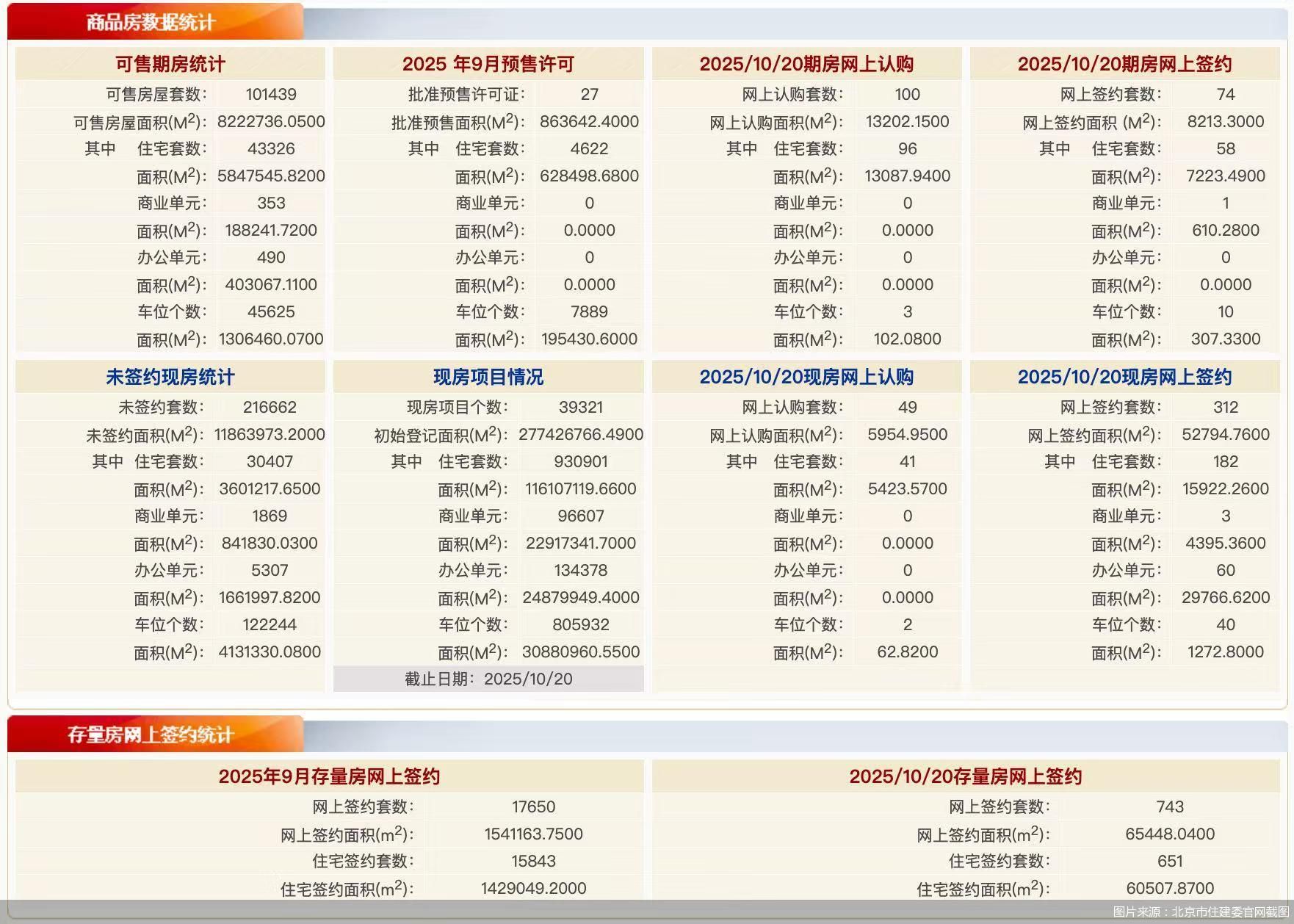 北京新房市场交易情况 - 10月20日单日新房网签386套 网签面积61008.06平方米 [1] - 其中住宅网签240套 网签面积23145.75平方米 [1] - 截至2025年10月20日 可售期房住宅套数为43326套 可售面积为5847545.82平方米 [2] - 2025年9月新增住宅预售套数4622套 新增预售面积628498.68平方米 [2] - 未签约现房住宅套数为30407套 未签约面积为3601217.65平方米 [2] 北京二手房市场交易情况 - 10月20日单日二手房网签743套 网签面积65448.04平方米 [1] - 其中住宅网签651套 网签面积60507.87平方米 [1] - 2025年9月全月存量房网上签约17650套 签约面积1541163.75平方米 [3] - 其中住宅签约15843套 签约面积1429049.2平方米 [3] 北京商品房库存与供应 - 可售期房总套数101439套 可售面积8222736.05平方米 [2] - 2025年9月批准预售许可证27个 批准预售面积863642.4平方米 [2] - 未签约现房总套数216662套 未签约面积11863973.2平方米 [2] - 现房项目个数39321个 初始登记总面积277426766.49平方米 [2]