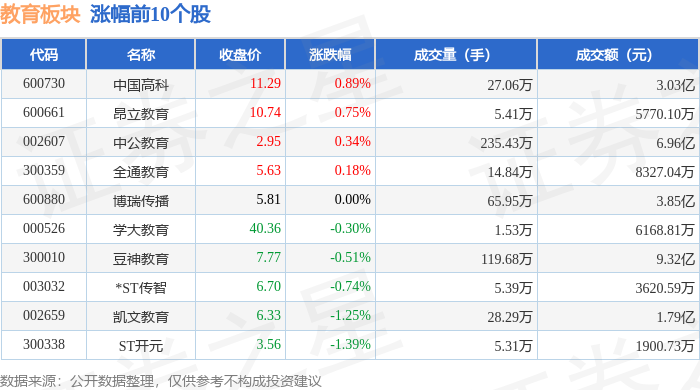 教育板块市场表现 - 2024年1月20日,教育板块整体下跌1.21%,表现弱于大盘,当日上证指数微跌0.01%,深证成指下跌0.97% [1] - 板块内个股表现分化,科德教育领跌,跌幅达5.26%,*ST国化、ST东时、行动教育、国脉科技跌幅均超过2% [2] - 部分个股逆势上涨,中国高科上涨0.89%,昂立教育上涨0.75%,中公教育上涨0.34%,全通教育上涨0.18% [1] 个股交易数据 - 成交量方面,豆神教育成交119.68万手,中公教育成交235.43万手,博瑞传播成交65.95万手,显示较高市场关注度 [1] - 成交额方面,科德教育成交额达5.11亿元,豆神教育成交额达9.32亿元,博瑞传播成交额达3.85亿元,中国高科成交额达3.03亿元 [1][2] - 部分ST及问题公司成交相对清淡,如学大教育成交1.53万手,行动教育成交1.36万手,*ST传智成交5.39万手 [1][2] 板块资金流向 - 当日教育板块整体呈现主力资金净流出状态,净流出金额为1.05亿元 [2] - 游资资金呈现净流入,净流入金额为1.20亿元,而散户资金净流出1552.1万元 [2] - 个股资金流向分化显著,豆神教育获主力资金净流入3643.87万元,同时获游资净流入4627.76万元,但遭散户净流出8271.63万元 [3] - 博瑞传播获主力资金净流入2474.17万元,昂立教育获主力资金净流入348.42万元 [3] - 学大教育遭主力资金净流出438.68万元,ST开元遭主力资金净流出98.38万元,凯文教育遭主力资金净流出183.83万元 [3]