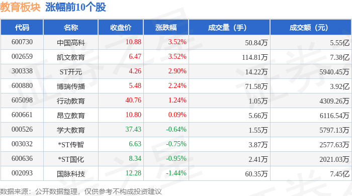 证券之星消息,11月26日教育板块较上一交易日下跌0.91%,科德教育领跌。当日上证指数报收于 3864.18,下跌0.15%。深证成指报收于12907.83,上涨1.02%。教育板块个股涨跌见下表: | 代码 | 名称 | 收盘价 | 涨跌幅 | 成交量(手) | 成交额(元) | | --- | --- | --- | --- | --- | --- | | 600730 | 中国高科 | 10.88 | 3.52% | 50.84万 | 5.55 Z | | 002659 | 凯文教育 | 6.47 | 3.52% | 114.81万 | 7.38亿 | | 300338 | ST开元 | 4.26 | 2.90% | 14.22万 | 5940.45万 | | 600880 | 博瑞传播 | 5.48 | 2.24% | - 71.58万 | 3.92亿 | | 605098 | 行动教育 | 40.76 | 1.24% | 1.05万 | 4309.26万 | | 600661 | 昂立教育 | 10.80 | 0.09% | 5.66万 | 6116.54万 | | 000526 | 学大教育 | ...