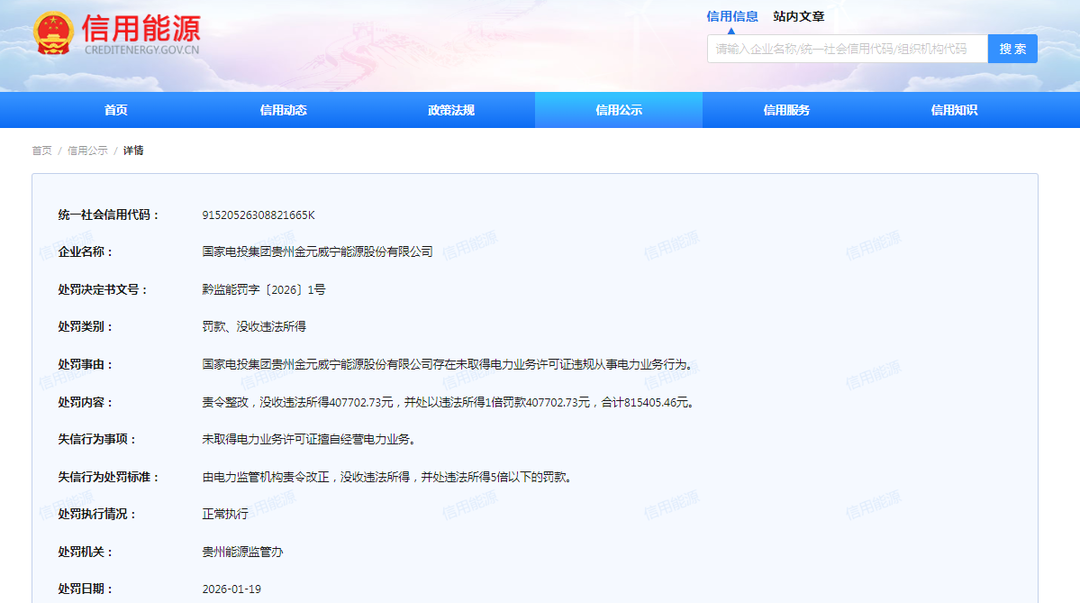 国家电投威宁能源公司被罚:未取得许可证违规从事电力业务