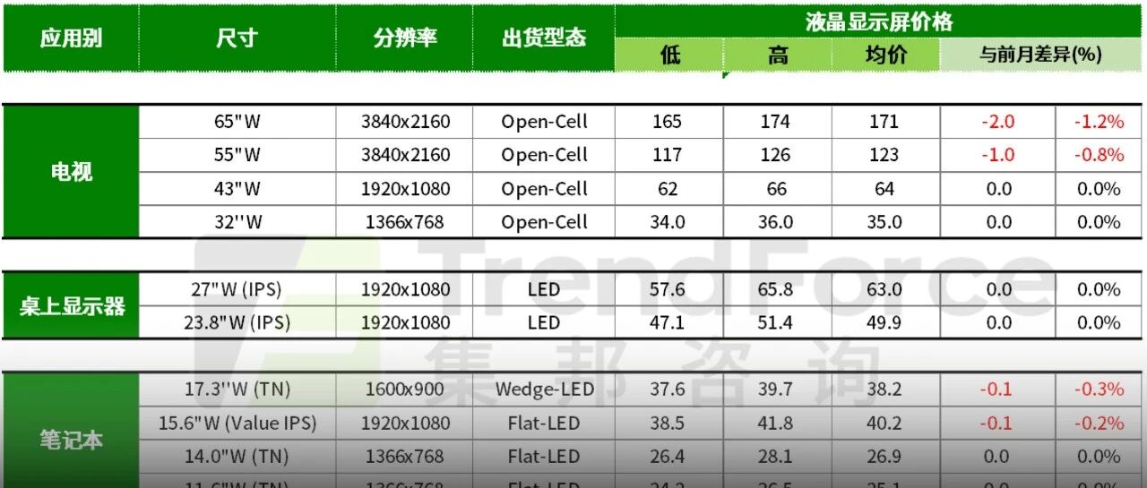 以下文章来源于TrendForce集邦 ,作者TrendForce TrendForce集邦 . TrendForce集邦咨询是一家全球高科技产业研究机构,研究领域横跨存储器、AI服务器、集成电路与半 导体、晶圆代工、显示面板、LED、AR/VR、新能源(含太阳能光伏、储能和电池)、AI机器人及汽车 科技等,提供前瞻性行业研究报告、产业分析 根据TrendForce集邦咨询旗下显示器研究中心《 TrendForce 2025面板价格预测月度报告 》最新调 研数据,2025年10月,部分尺寸电视、笔电面板价格有小幅下调,显示器面板价格与前月保持一 致。具体内容如下: | 应用别 | ਮਿਕ | 分辨率 | 出货型态 | | | 液晶显示屏价格 | | | | --- | --- | --- | --- | --- | --- | --- | --- | --- | | | | | | 18 | 흥 | 相机 | 与前月差异(%) | | | 电视 | 65" M | 3840x2160 | Open-Cell | 162 | 174 | 171 | -2.0 | -1.2% | | | 55" W | 3840 ...
