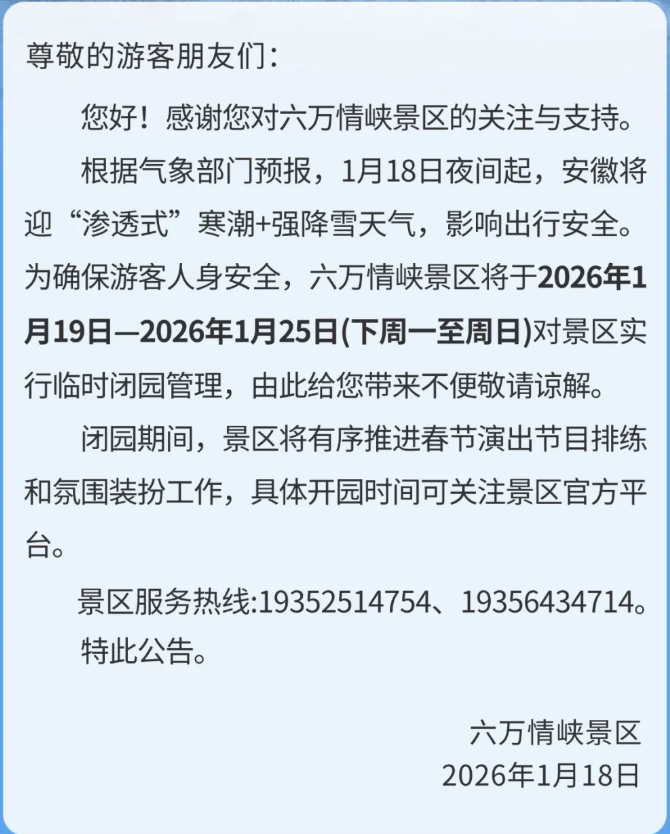 核心观点 - 受强冷空气及偏南水汽影响,陕西全省将经历一次寒潮、雨雪、冰冻天气过程,导致省内多家景区为保障游客安全而临时关闭 [1] 景区运营影响 - 华山景区自1月18日18时起暂时关闭华山门徒步登山线路,因预计当晚至后天将有大到暴雪天气 [1] - 翠华山景区、终南山南五台景区、王顺山国家森林公园、辋川溶洞、红色葛牌景区等也发布了临时关闭公告 [1] 气象预警与风险 - 陕西省文化和旅游厅与陕西省气象局联合发布旅游气象风险预警,指出本次寒潮过程冷空气强、气温降幅大、影响范围广 [1] - 全省大部有明显雨雪天气,秦巴山区部分地方有冻雨或冰粒 [1] - 预计1月19-20日陕西全省有一次寒潮、雨雪、冰冻天气过程,并伴随明显的降温天气 [1]