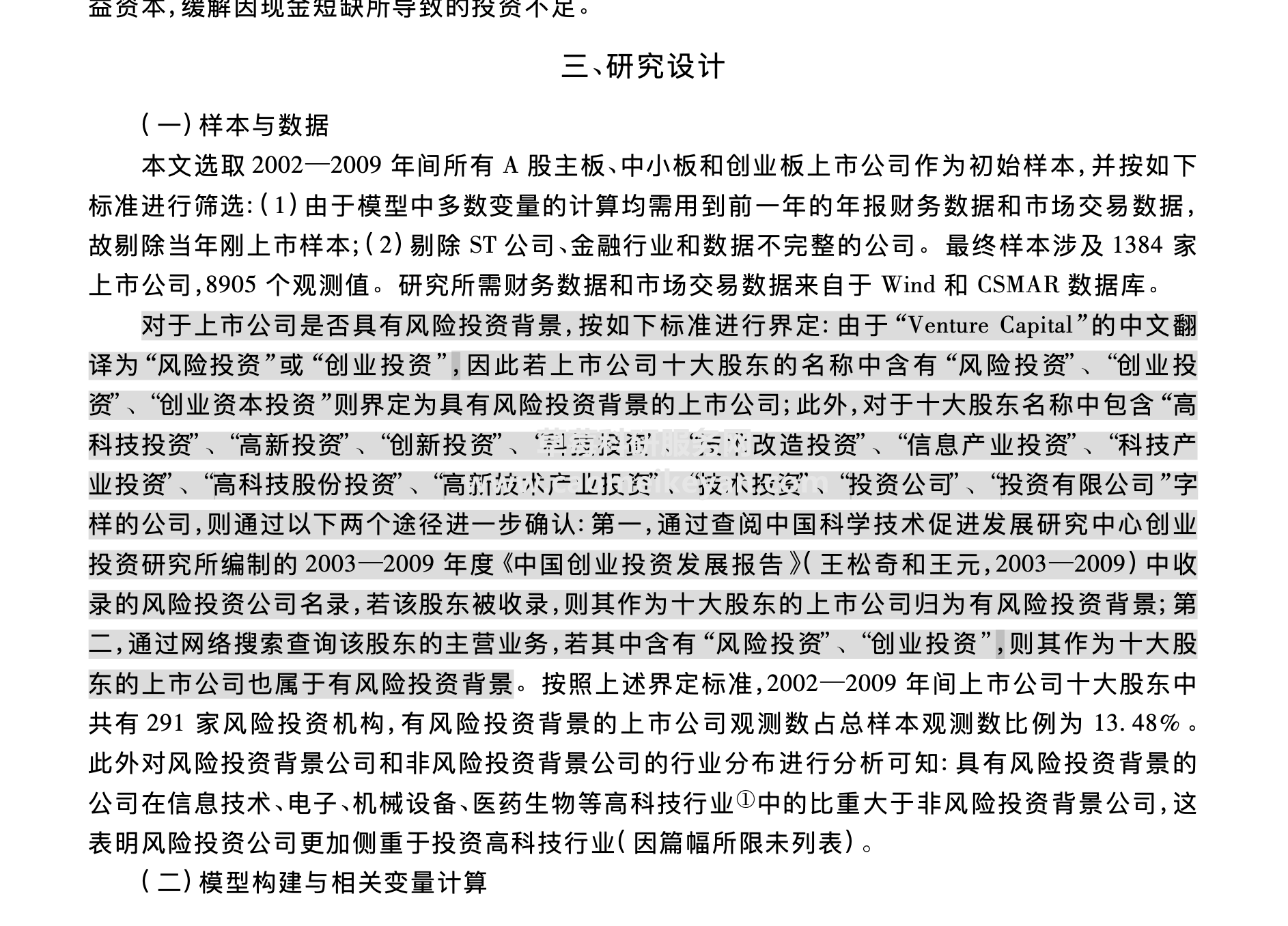 数据集概况 - 数据集名称为“2025-2003年上市公司企业风险投资数据”,覆盖2003年至2025年的时间范围 [1] - 数据样本量超过7万个,涉及5700多家上市公司 [1] - 数据集包含原始数据、计算代码及最终结果,可供验证 [1] 风险投资背景界定标准 - 界定上市公司是否具有风险投资背景的核心标准是审查其十大股东名称 [1][5] - 若十大股东名称直接包含“风险投资”、“创业投资”或“创业资本投资”,则界定为有风险投资背景 [1][5] - 若十大股东名称包含“高科技投资”、“高新投资”、“创新投资”、“科技投资”、“技术改造投资”、“信息产业投资”、“科技产业投资”、“高科技股份投资”、“高新技术产业投资”、“技术投资”、“投资公司”或“投资有限公司”等字样,则需通过两个途径进一步确认 [1][5] - 进一步确认的途径一:查阅《中国创业投资发展报告》收录的风险投资公司名录,若股东被收录则其持股公司归为有风险投资背景 [1][5] - 进一步确认的途径二:通过网络搜索查询股东主营业务,若主营业务包含“风险投资”或“创业投资”,则其持股公司也属于有风险投资背景 [1][5] 研究样本与描述性统计 - 研究选取2002年至2009年间所有A股主板、中小板和创业板公司,经筛选后得到8905个观测值 [5] - 按照上述标准,共识别出291家风险投资机构,样本中有风险投资背景的上市公司观测值占比为13.5% [5][6] - 有风险投资背景的上市公司更集中于信息技术、电子、机械设备、医药生物等高科技行业 [5] - 在有风险投资背景的公司中,60.5%的风险投资股东具有政府背景 [6] - 在有风险投资背景的公司中,41.9%的风险投资股东具有IPO经验 [6] 关键财务与融资变量均值 - 样本公司新增投资额均值为总资产的5.4% [6] - 样本公司过度投资均值为10.8%,投资不足均值为6.6% [6] - 样本公司有息债务融资额均值为总资产的2.4%,其中短期和长期有息债务融资额均值均为总资产的1.2% [6] - 样本公司权益融资额均值为总资产的2.02%,调整后权益融资额均值为总资产的2.00% [6] - 风险投资背景公司的风险投资平均持股比例为9.0% [6] 数据示例 - 数据以表格形式呈现,包含股票代码、年份、风险投资背景哑变量、风险投资持股比例、联合投资哑变量、国有背景哑变量、声誉哑变量等字段 [7] - 示例显示,股票代码603583在2025年具有风险投资背景,风险投资持股比例为6.4%,其风险投资股东具有IPO经验 [7] - 示例显示,股票代码603606在2025年具有风险投资背景,风险投资持股比例为4.01%,且为联合投资,其风险投资股东具有政府背景 [7]