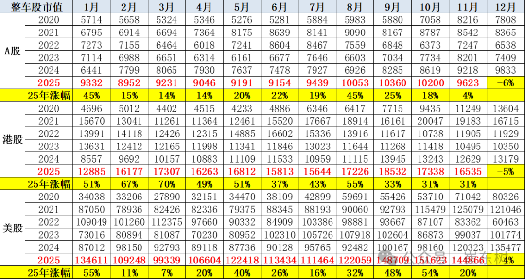 全球整车企业市值概览 - 2025年11月全球整车企业总市值以美股市场最大,规模达14.5万亿元人民币,环比10月下降4%,但同比增长20% [1][2] - 港股市场整车企业市值(不含小米)达1.65万亿元人民币,环比下降5%,但同比大幅增长31% [1][2] - A股市场整车企业市值达9623亿元人民币,环比下降6%,同比增长4% [1][2] - 从2024年1月到2025年11月,港股整车企业市值从0.8万亿元增长至1.6万亿元,实现大幅增长,A股市场从2023年1月的5800亿元增长至2025年11月的10000亿元,增长相对平缓,美股市场则从8.7万亿元增长至15.2万亿元,增幅较大 [4] 中国汽车产业链市值结构变化 - 汇总A股、港股、美股三地中国车企及产业链公司市值,2025年11月汽车零部件市值占比为39.6%,较2024年同期的37.9%提升,表现较强 [1][6] - 同期整车企业市值占比为32.8%,较2024年同期的37.7%下降较快,尽管有奇瑞汽车加入,但占比仍明显下降 [1][6] - 电池企业市值占比为24.7%,较2024年同期的21.6%提升,显示上游企业话语权放大 [1][6] - 2023年以来电池企业市值提升较快,已接近整车企业市值 [7] 主要整车企业市值表现 - 2025年11月,特斯拉市值达101276亿元人民币,环比增长6%,同比增长27%,在全球整车企业中表现相对顽强 [9][11] - 多家中国车企11月市值环比下滑,如赛力斯(-14%)、理想汽车(-12%)、上汽集团(-10%)、蔚来(-24%) [9] - 部分车企同比增幅显著,如岚图汽车同比增长163%,海马汽车同比增长101%,零跑汽车同比增长99%,小鹏汽车同比增长79% [9] - 11月日本车企及商用车企市值表现相对较强 [11] 不同类别整车企业市值走势 - 2025年1月至11月,特斯拉市值波动较大,11月环比下降6% [11] - 同期,国际车企(除特斯拉)市值环比变化平缓,11月环比增长0% [11] - 中国民营车企、大型汽车集团、新势力及“创二代”车企市值在11月普遍环比下降,降幅在3%至8%之间 [11] - 11月内销车企表现压力较大,出口是新能源车核心增长点,出口强的企业表现较好 [12] 主要上市公司估值水平分析 - 特斯拉市值规模巨大,2025年11月市盈率达202倍,估值水平显著偏高 [13] - 零跑汽车、岚图汽车等新能源车企市盈率也处于较高水平 [13] - 国际传统车企市盈率普遍较低,丰田汽车为8倍,本田为5倍,通用汽车为10倍,福特汽车为10倍,Stellantis为5倍 [13][14] - 部分国际车企市净率处于低位,如Stellantis为0.4,本田为0.5,通用和福特约为1.1 [14] - 中国部分传统车企如奇瑞汽车、吉利汽车市盈率约为9倍 [14]