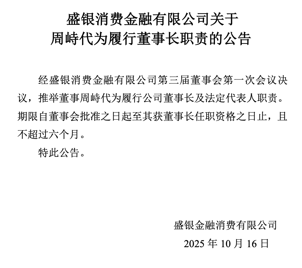 近日,盛银消费金融有限公司(下称"盛银消金")在官网发布的公告显示,经盛银消金第三届董事会第一次会议决议,推举董事周峙代为履行公司董事长及 法定代表人职责。期限自董事会批准之日起至其获董事长任职资格之日止,且不超过六个月。 值得一提的是,就在一个多月前,9月4日,辽宁金融监督管理局刚核准周峙盛银消金董事的任职资格。 周峙"代行"董事长职责 人事变动频繁 事实上,在盛京银行2025年4月发布的2024年年度报告中提到,周峙已于2025年1月获推荐为盛银消费金融董事长。但其任职资格一直未被核准。直至2025年 9月4日,其盛银消金董事的任职资格被核准,但董事长一职的任职资格仍待进一步批复。 其简历显示,周峙为盛京银行任职超30年的"老将",2015年2月获聘为该行董事会秘书,1991年8月就已加入该行前身沈阳合作银行的南湖支行。2006年6月 至2019年9月,周峙先后担任该行监事会办公室主任、发展战略研究中心副主任及主任;2005年5月至2006年6月期间,担任该行行长办公室副主任。 1998年5月至2005年5月期间,周峙担任市场发展部总经理助理、副总经理以及发展战略研究中心副主任;1991年8月至1998年 ...