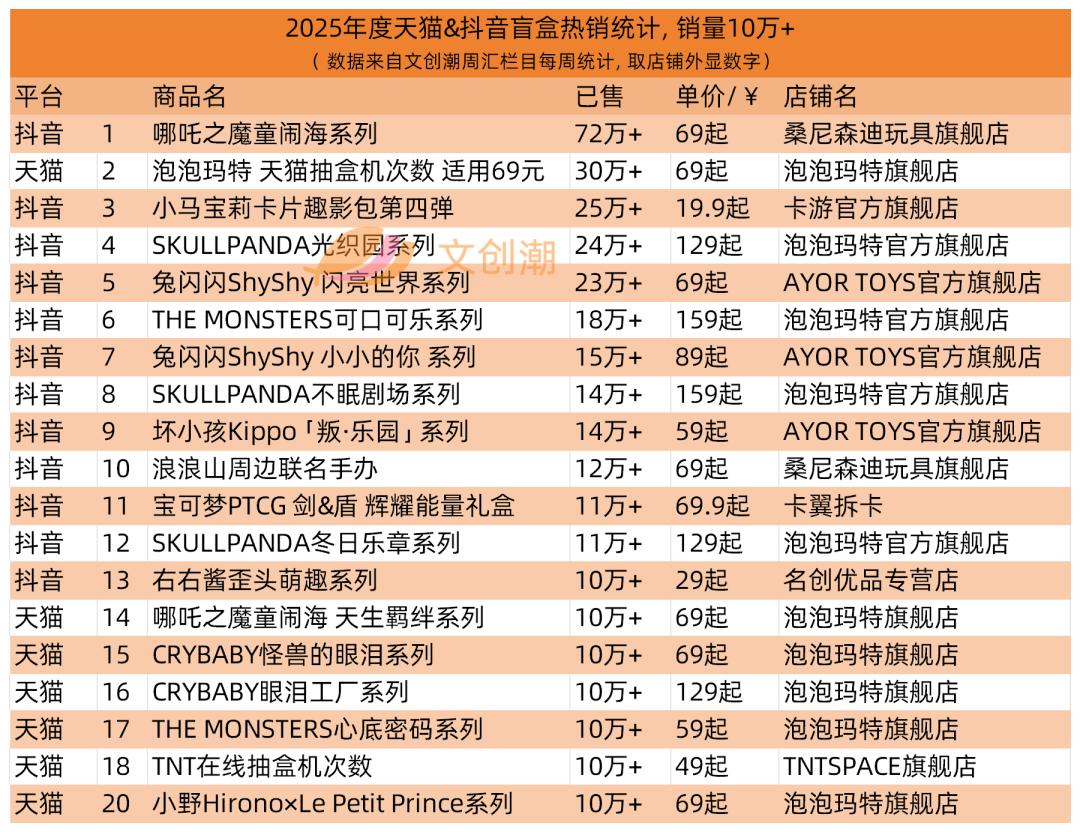 即将落下帷幕的2025年,与IP相关的哪些商品表现突出? 今年,文创潮的"文创新经济周汇"栏目,发布了整整52期内容,每周为大家盘点潮流玩具与各类手办、卡牌、毛绒玩具、IP店铺等方面信息。 从这52期内容中的天猫与抖音平台盲盒热销榜,我们可以看到: 今天,文创潮再次基于这一年的统计进行简要解读,供大家参考。 (特别说明:许多爆款产品售罄后撤下链接,另外抖音榜单实时变化,都可能导致统计缺漏。另外表格中的销量是上榜之时文创潮统计到的数字,后续它 们可能会跌出榜单前列,但销量会继续提升。) 销量超10万的爆款盲盒 | | | | 2025年度天猫&抖音盲盒热销统计,销量10万+ | | | | --- | --- | --- | --- | --- | --- | | | | | (数据来自文创潮周汇栏目每周统计,取店铺外显数字) | | | | 平台 | | 商品名 | 已售 | 車价/¥ | 店铺名 | | 抖音 | 7 | 哪吒之魔童闹海系列 | 72万+ | 69起 | 桑尼森迪玩具旗舰店 | | 天猫 | 2 | 泡泡玛特 天猫抽盒机次数 适用69元 | 30万+ | 69起 | 泡泡玛特旗舰店 | | ...