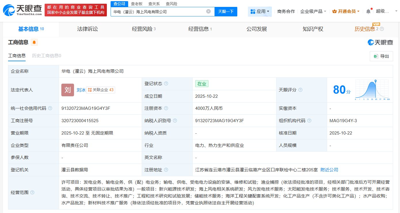 公司基本信息 - 公司名称为华电(灌云)海上风电有限公司,成立于2025年10月22日,登记状态为在业 [1][2] - 公司法定代表人为刘冰,注册资本为4000万元人民币 [1][2] - 公司注册地址位于江苏省连云港市灌云县灌云临港产业区口岸联检中心二楼205室 [2] - 公司类型为有限责任公司,所属行业为电力、热力生产和供应业 [2] 公司业务范围 - 公司经营范围包括新兴能源技术研发、海上风电相关系统研发、风力发电技术服务和太阳能发电技术服务等 [1][2] - 具体业务涵盖发电、输电、供(配)电业务,以及储能技术服务、海洋工程关键配套系统开发等 [2] 公司股权结构 - 公司由华电新能源集团股份有限公司、连云港市能源集团有限公司、灌云绿港能源管理有限公司和远景能源有限公司共同持股 [1][2] - 华电新能源集团股份有限公司为控股股东,持股比例为80%,股东性质为国有控股 [2] - 连云港市能源集团有限公司持股10%,灌云绿港能源管理有限公司持股7%,远景能源有限公司持股3% [2]